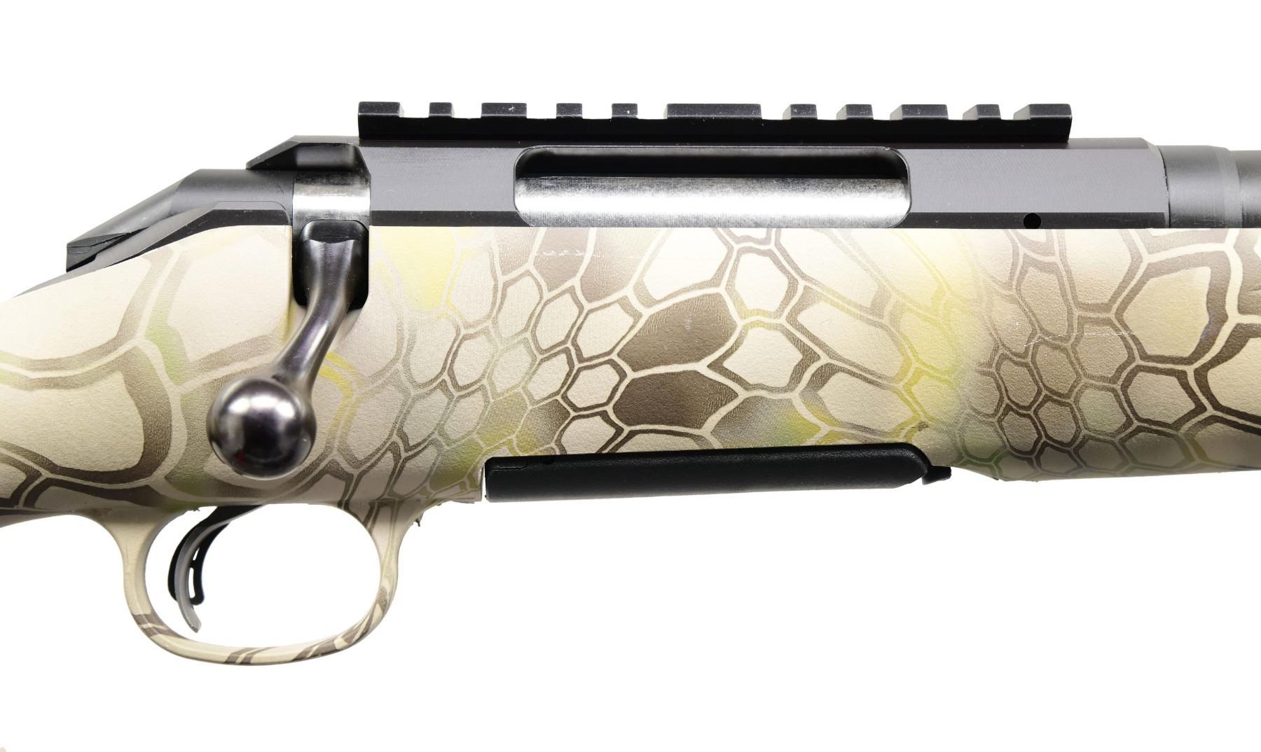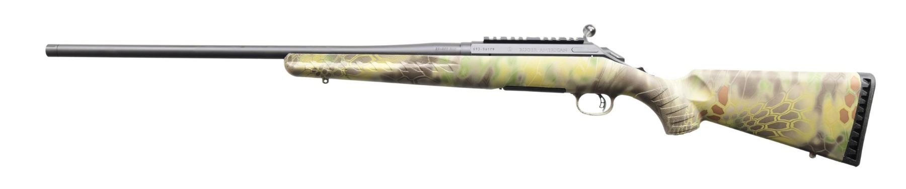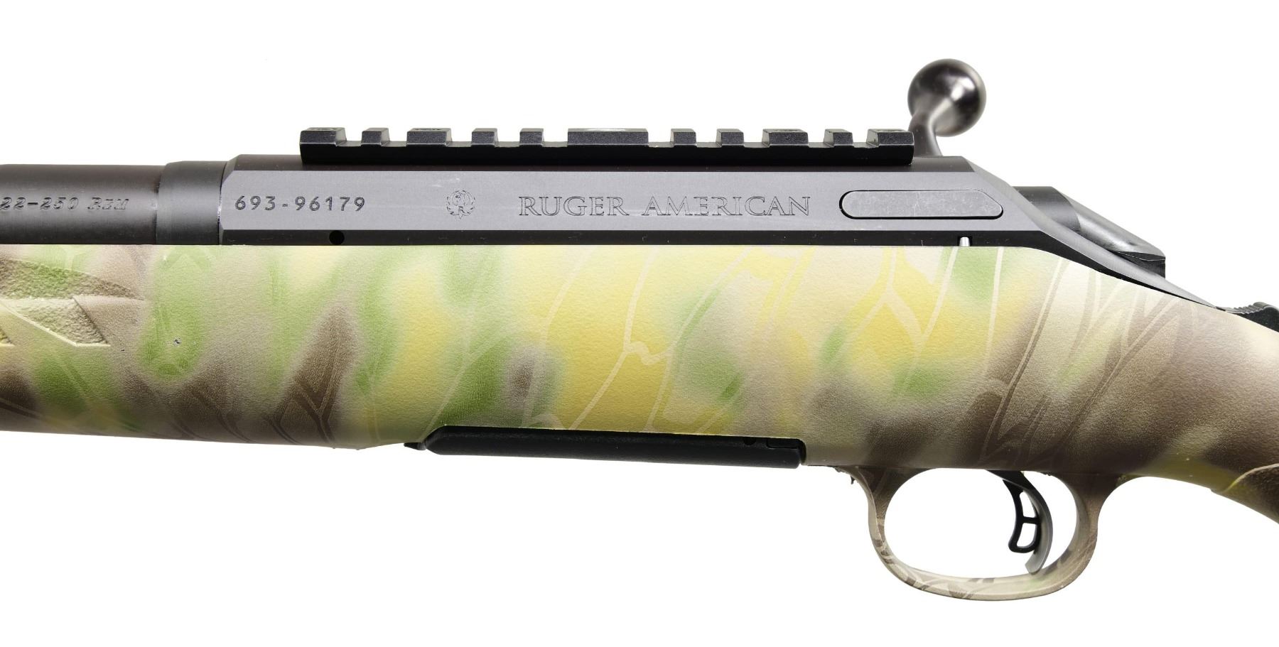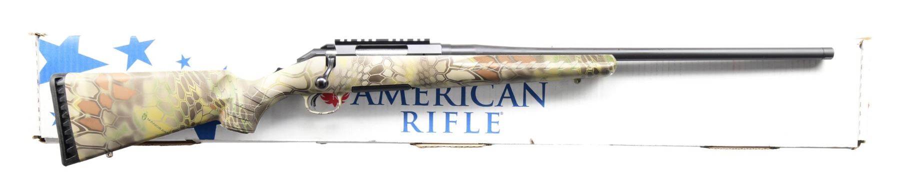 MATCHING BOX. Cal. 22-250. S# 693-96179 (2015). Model 16910 with 22" threaded barrel; without sights. One-piece Ruger base on receiver. Adjustable trigger. Mandrake Camo synthetic stock. MAGS: one 4 rd. UNATTACHED ACCESSORIES: matching box containing paperwork. CONDITION: all aspects appear near excellent, including bore. (24-3100/MD). MODERN. $300-500.