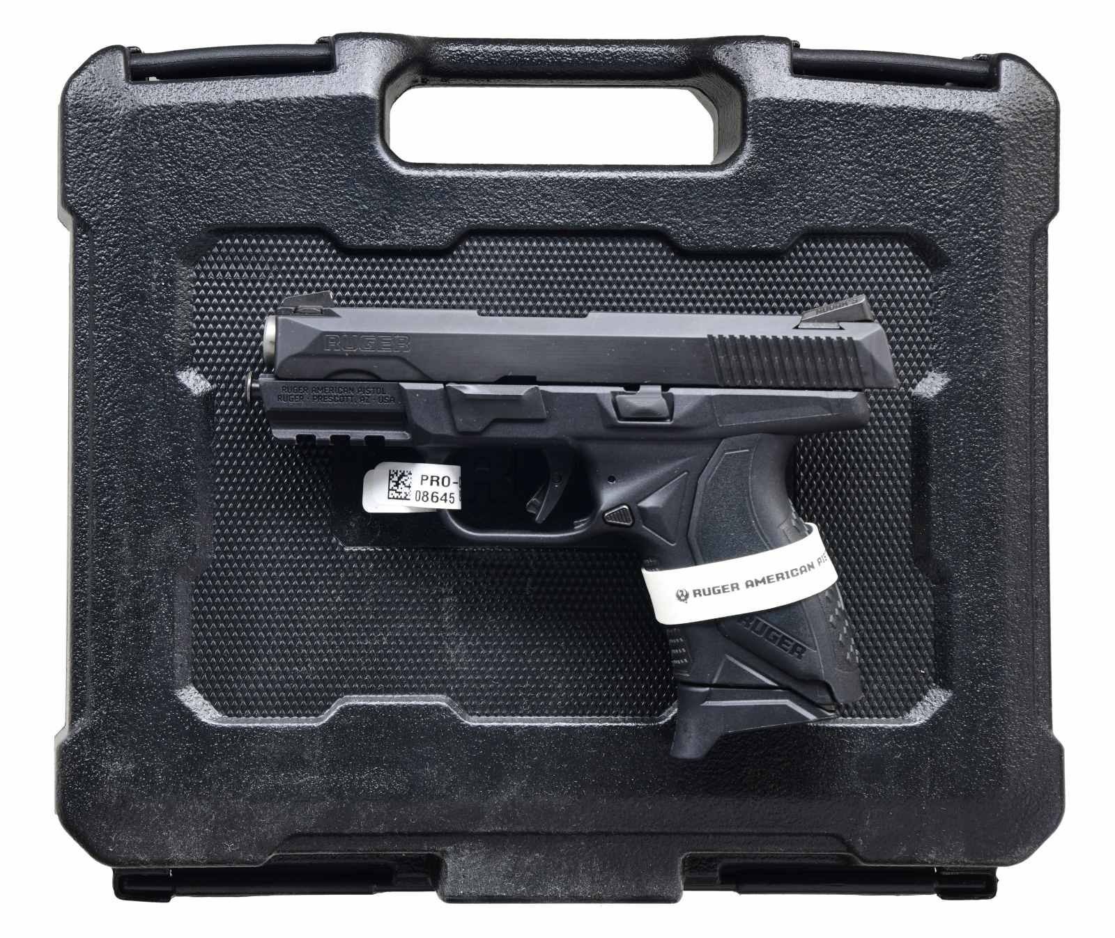 MATCHING FACTORY CASE. Cal. 45 ACP. S# 861-29258. Bbl. 3 5/8". American Pro semi-automatic pistol mfg. by Ruger in 2017. Sides of slide are marked "RUGER", with the model designation and Ruger's mfg. information marked on the left side of the frame. Slide exhibits a black oxide finish, with the stainless steel bbl. exhibiting a satin finish. Black polymer frame with 2-stage trigger and detachable backstrap. Novak 3-dot iron sights. MAGS: 1 7-rd. & 1 10-rd. UNATTACHED ACCESSORIES: matching factory case containing spare mag., spare backstrap, and factory paperwork. CONDITION: near new, with metal components retaining virtually all of their original factory finish, with the bbl. exhibiting some mild wear from hand cycling of the action. Mirror bore, exhibiting well defined rifling throughout. Polymer frame is excellent overall. Case is very good. (23-6131/MLW). MODERN. $300-500.