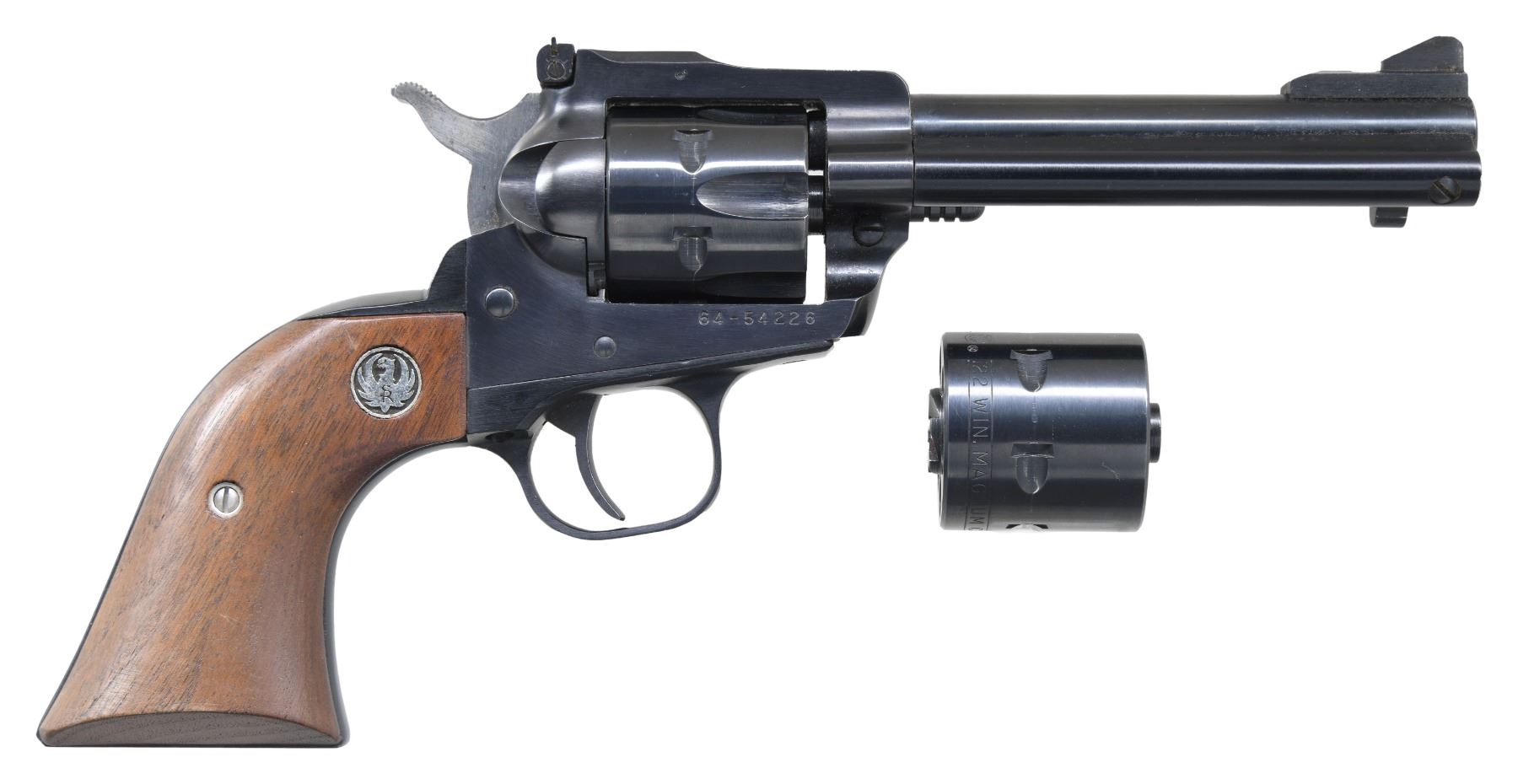 CONVERTIBLE REVOLVER. Cal. 22 LR / 22 Mag. S# 64-54226. Bbl. 4 5/8" with screw attached serrated blade on ramped base plus frame mounted factory adjustable rear sight. Blued model mfg. 1976 (1973 to date) with "MADE IN THE 200th YEAR OF AMERICAN LIBERTY" on top of barrel that is without "warning" marks which were instituted the following year. Standard features of XR3-RED alloy grip frame, oiled walnut grips having silver eagle medallions, alloy ejector housing and LR fluted cylinder without firing pin groove. UNATTACHED ACCESSORIES: near excellent unfluted 22 Mag. cylinder and its red felt storage bag. CONDITION: hint of cylinder turn line and very slight thinning around front sight plus light staining on hammer sides; generally very good to excellent with near excellent bore and grips. (25-752/NW). MODERN. $450-600.