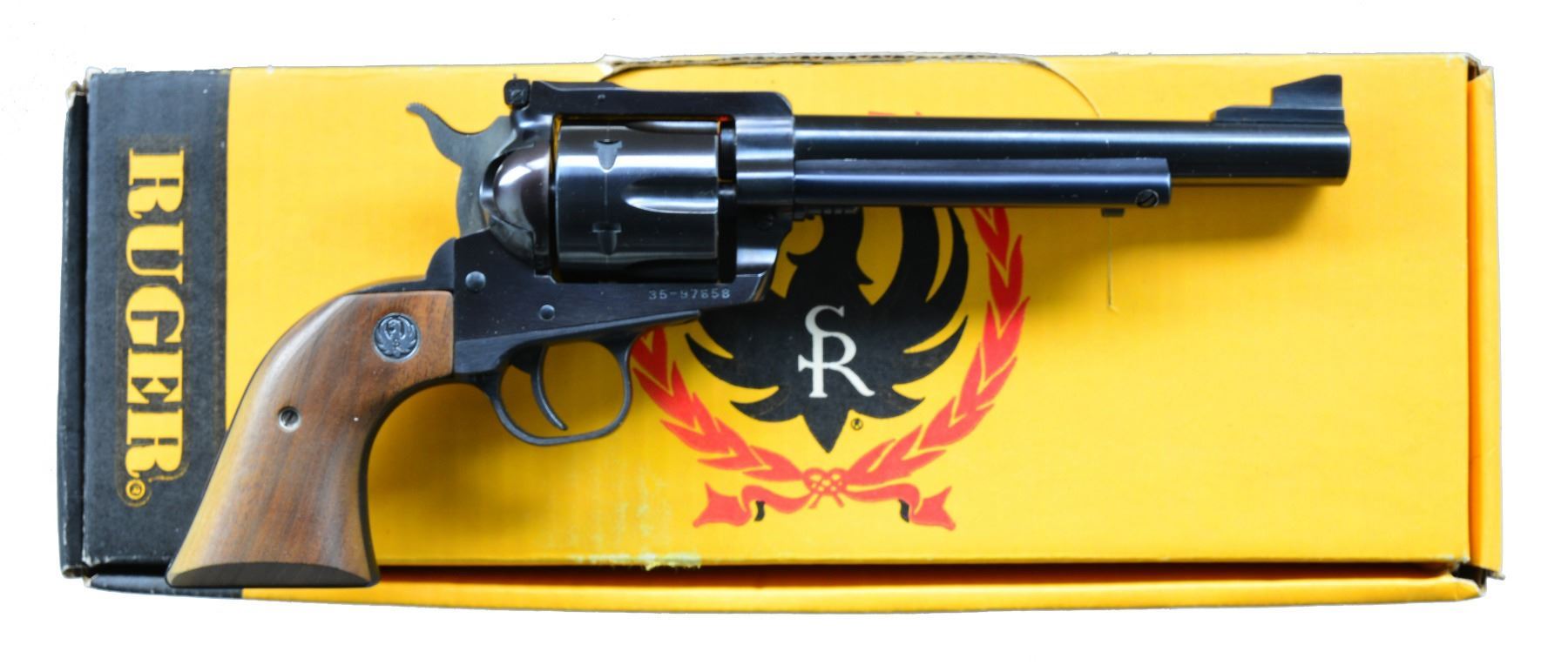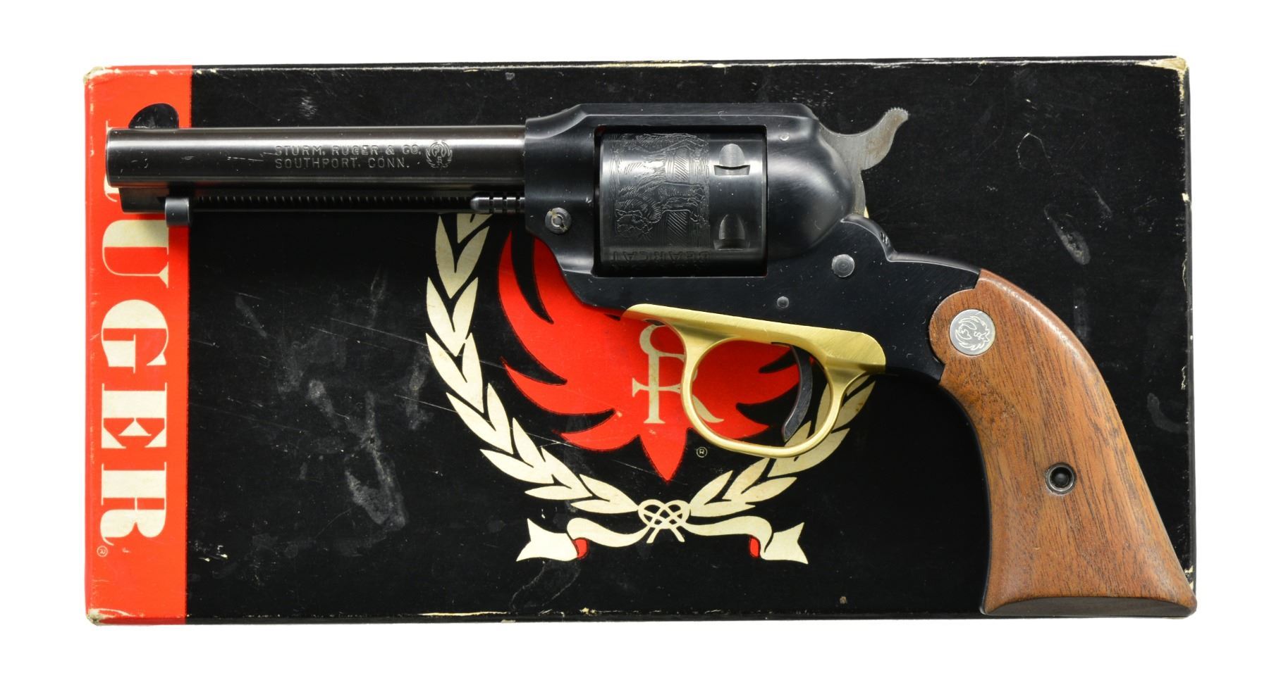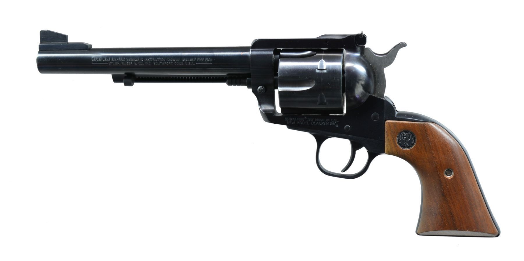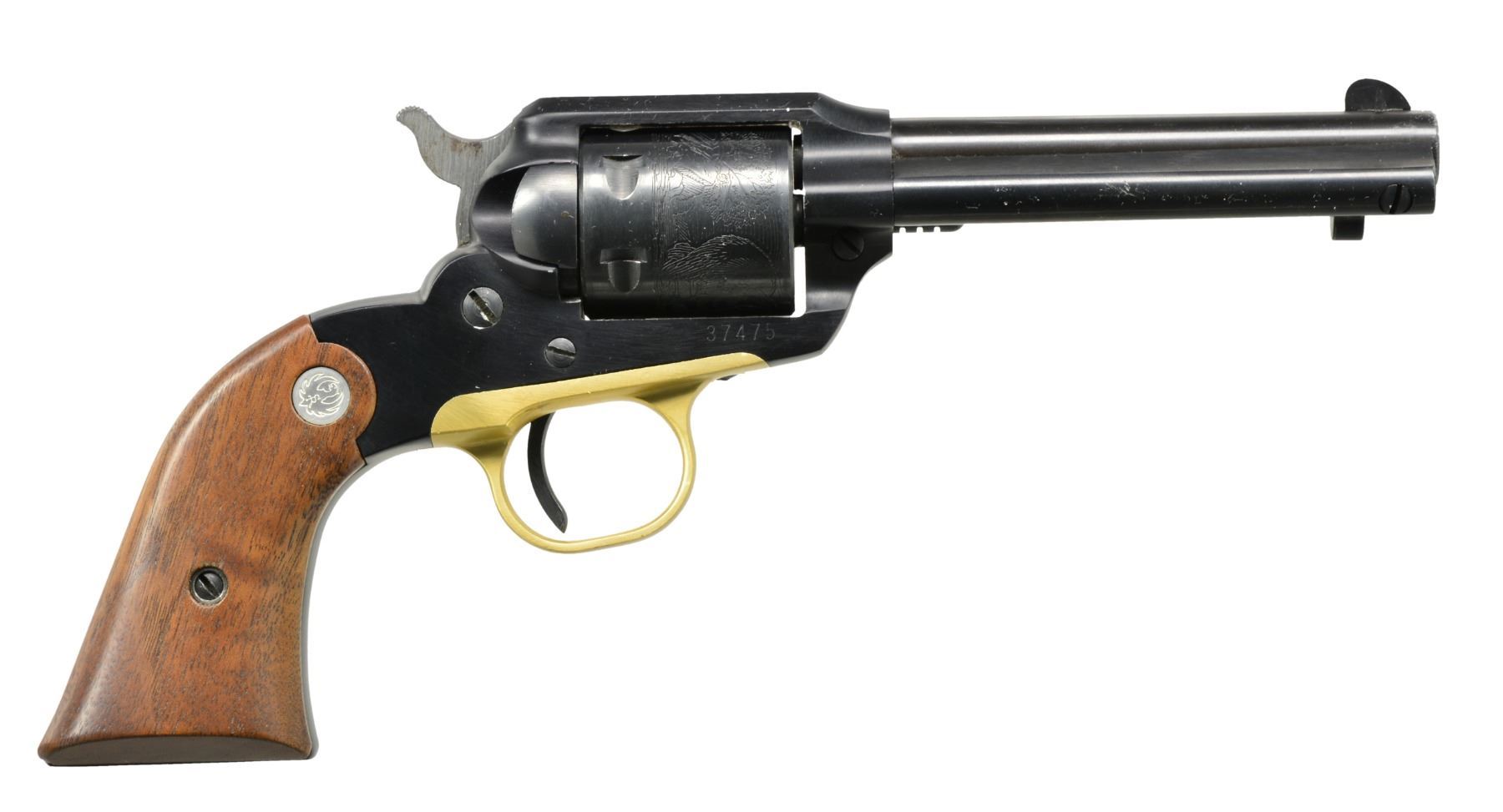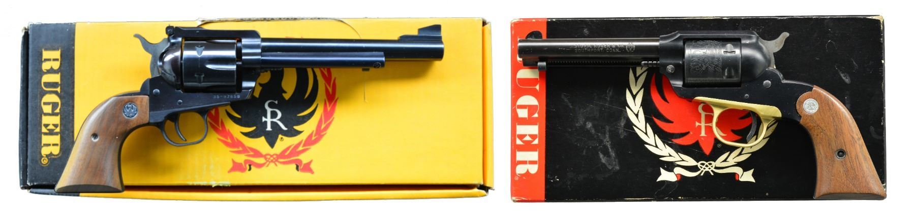 1) NEW MODEL BLACKHAWK. Cal. 357 Mag. S# 35-97658. Bbl. 6 1/2" w/ warning marks plus blade front sight & adj. rear. Mfg. 1982 w/ blued finish & walnut grips having silver eagle medallions. UNATTACHED ACCESSORIES: unlabeled Ruger hinged yellow box w/ manual. Near excellent Bucheimer brown sportsman style holster numbered 01-0116-43. CONDITION: faint cyl. turn line, all other aspects near excellent including bore. (20-428/NW). MODERN. 2) OM BEARCAT. Cal. 22 LR. S# 37475. Bbl. 4" w/ blade front sight & frame notch rear. Mfg. 1964 having black alloy frame & brass anodized trigger guard. Earlier model w/ steel ejector rod housing. Walnut grips w/ silver medallions. Original lock work w/out factory safety update. UNATTACHED ACCESSORIES: unnumbered original 2 piece box w/ manual & original uncompleted warranty card. CONDITION: overall very good to excellent w/ occasional very sm. or faint mark & slight firing residue. Near excellent bore & grips. (20-436/NW). CURIO. $650-900.
