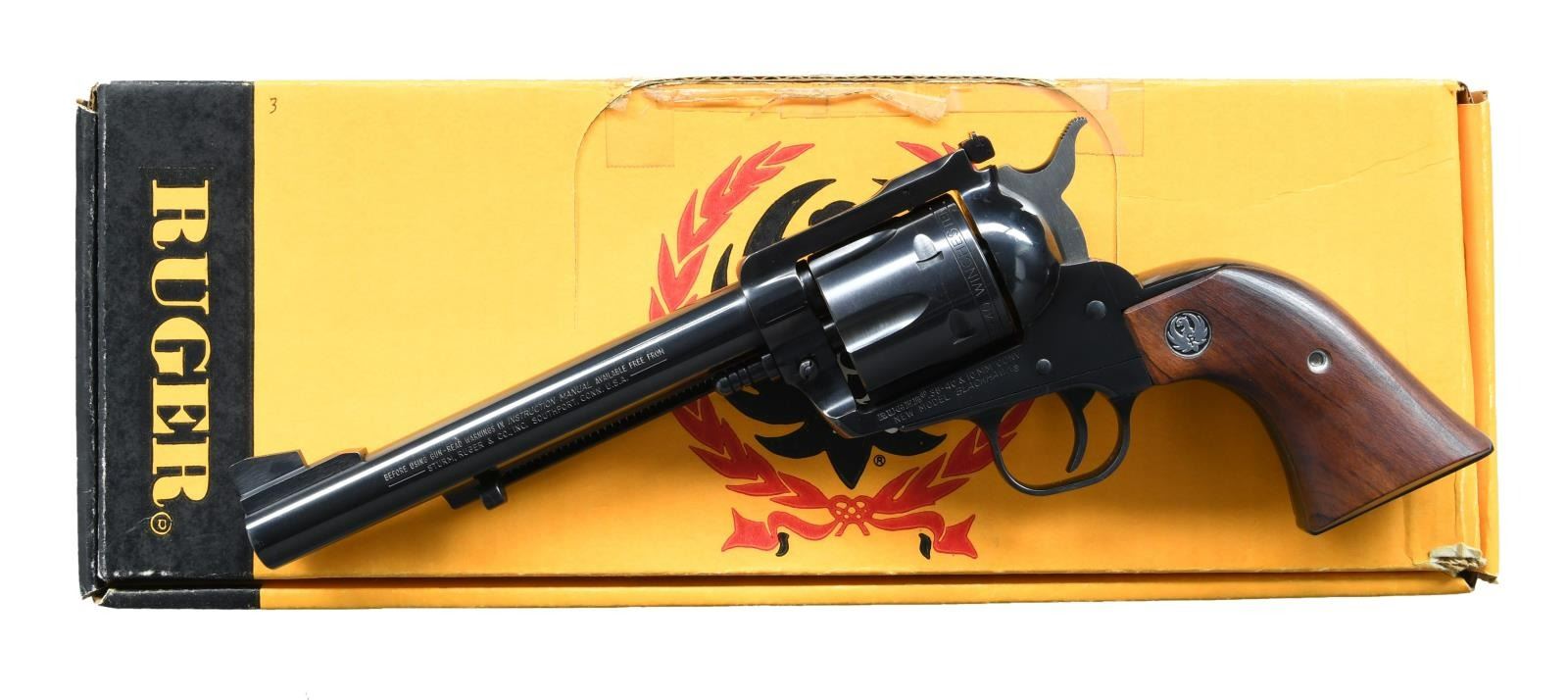REVOLVER. Cal. 38-40 / 10MM Auto. S# 611-00966. Bbl. 6 1/2" with ramped serrated blade sight; frame mounted adjustable rear. Mfg. 1990 only for Buckeye Sports of Ohio with distributor symbol (bumble bee at flower petal) on top strap. Numbered 611-00001 to 611-06199 with 2 matching numbered fluted cylinders (38-40 as primary, installed); listed as model S3840 by Ruger. Walnut grips with silver eagle medallions. UNATTACHED ACCESSORIES: original yellow and black box (unmarked) plus shipping sleeve that carries the matching number and model info. Auxiliary matching numbered 10MM Auto cylinder. CONDITION: all aspects near excellent including bore and grips; appears test fired only. (23-1512/NW). MODERN. $800-1.200.