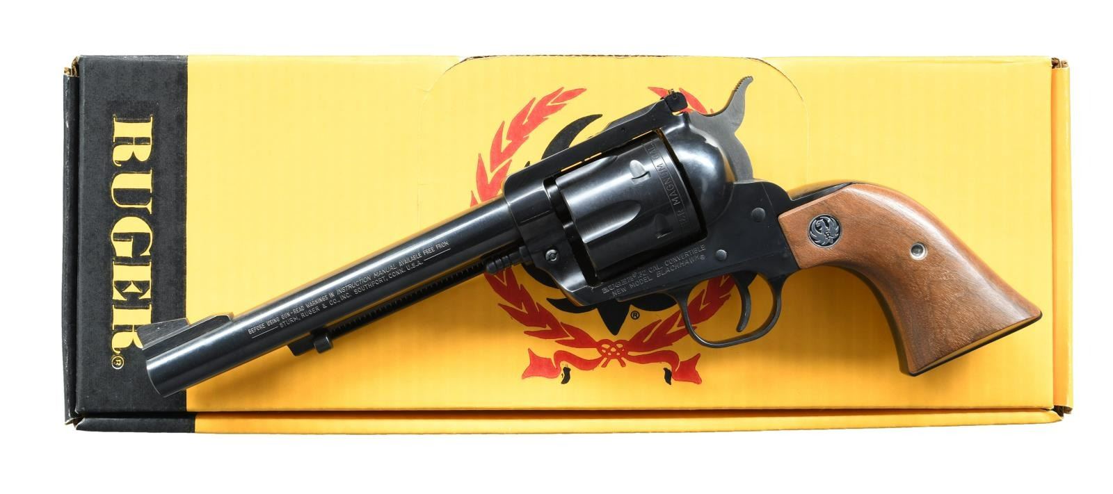 REVOLVER. Cal. 32 H&R Mag. / 32-20 S# 610-04771. Bbl. 6 1/2" with ramped serrated blade sight; frame mounted adjustable rear. Mfg. 1988 only for Buckeye Sports of Ohio with distributor symbol (bumble bee at flower petal) on top strap. Numbered 610-00001 to 610-05202 with 2 matching numbered fluted cylinders (32 H&R Mag. as primary, installed); listed as model S-32X by Ruger. Walnut grips with silver eagle medallions. UNATTACHED ACCESSORIES: original yellow and black box (unmarked) plus shipping sleeve that carries the matching number and model info. Auxiliary matching numbered 32-20 cylinder. Factory packaging. CONDITION: all aspects near excellent including bore and grips; appears new and unfired. (23-1517/NW). MODERN. $1,000-1.500.