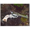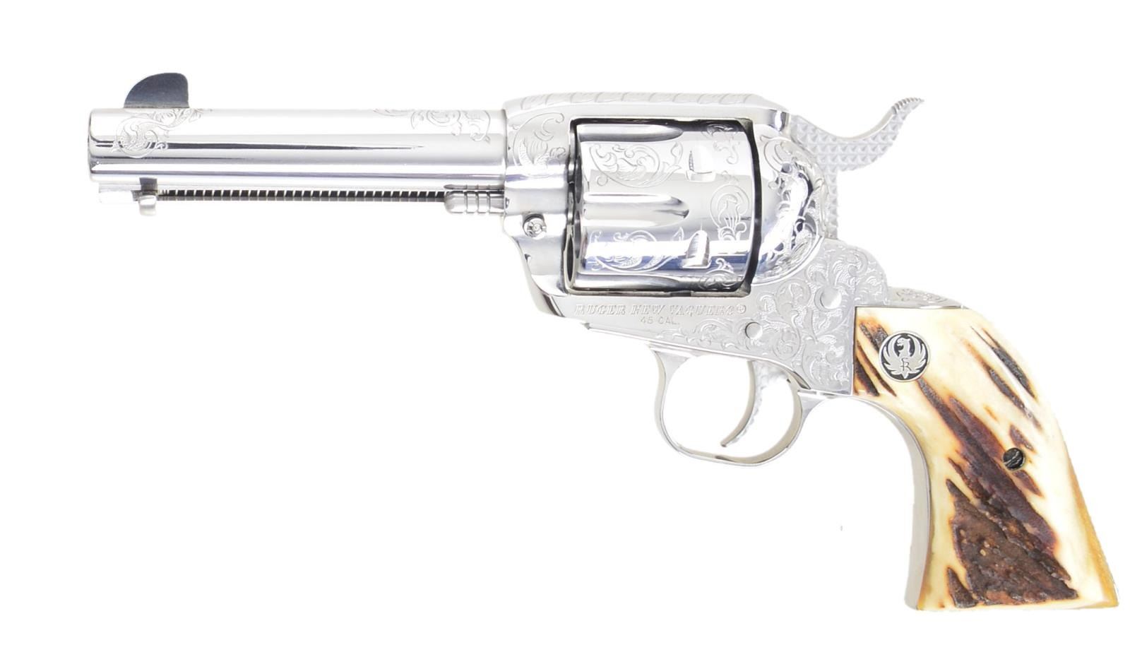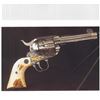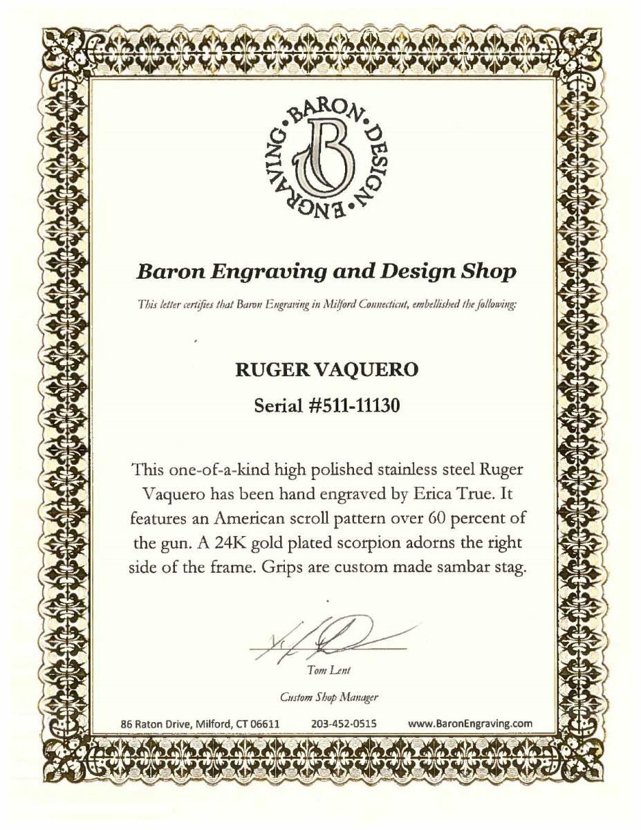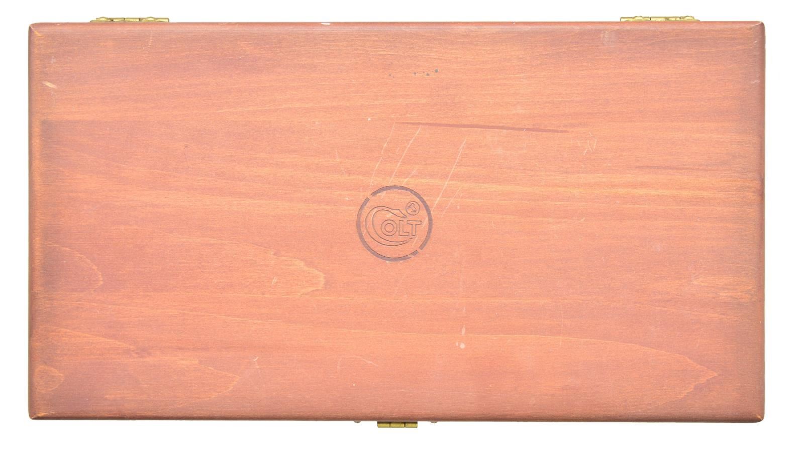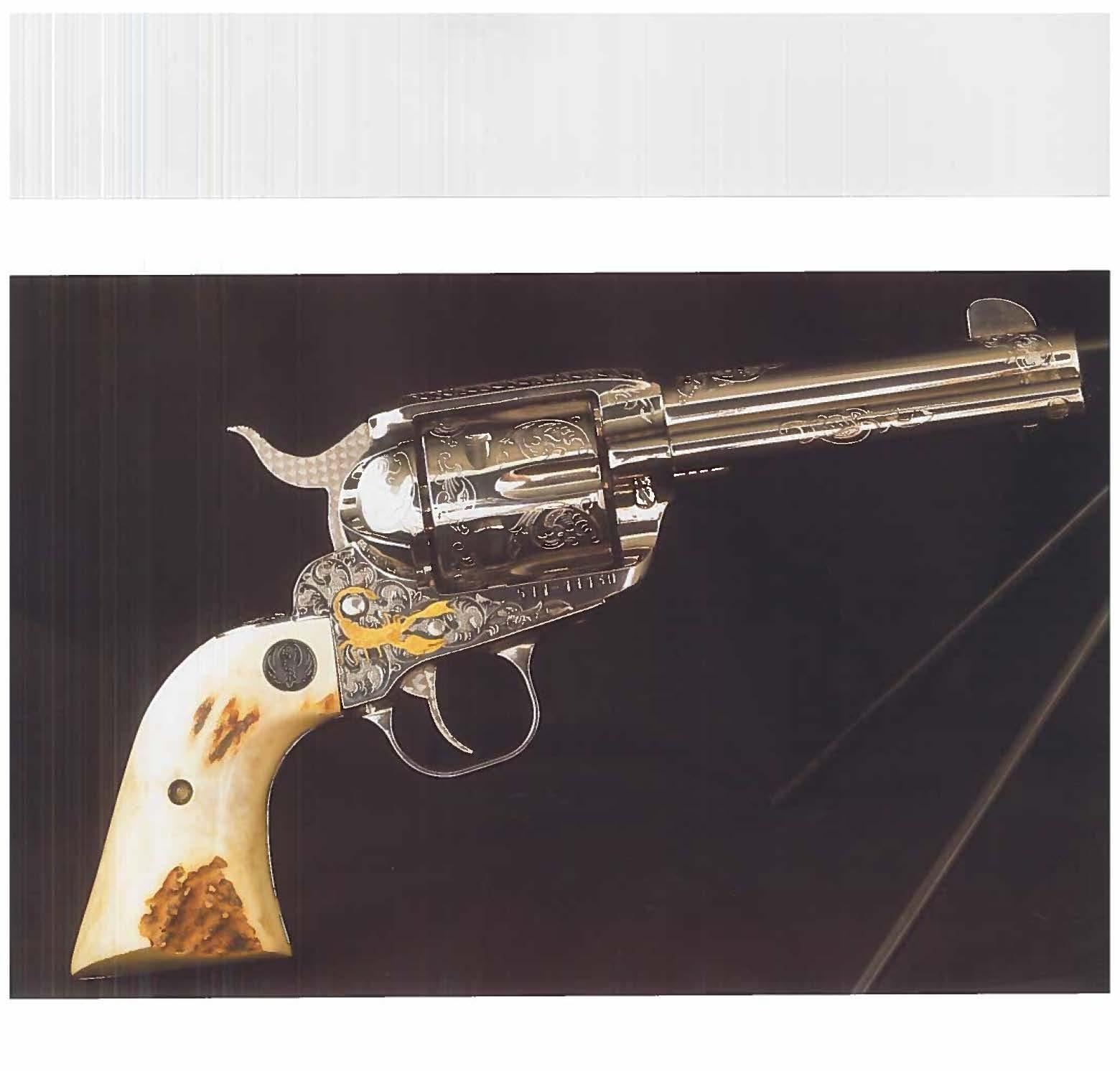 Cal. 45 LC. S# 511-11130. Bbl. 4 5/8". Fixed blade front sight with notch rear. Hammer and trigger are jeweled on the sides. Wonderful custom engraved high polished stainless steel by Erica True. American scroll pattern covering 60% of the gun and a 24K gold plated scorpion on the right side of the frame. Grips custom made Sambar Stag. UNATTACHED ACCESSORIES: brass hinged wooden Colt box with fitted red velvet interior. Box has some light scratches on the top of the lid and base and some fine chipping to the edges/corners. CONDITION: all aspects are near excellent, showing only minor handling marks and innocuous scratches. Bore is near excellent, bright and strongly rifled. PROVENANCE: letter from Baron Engraving and Design Shop Milford CT. indicating the work they performed. (22-5172/CW). MODERN. $1,000-1,500.