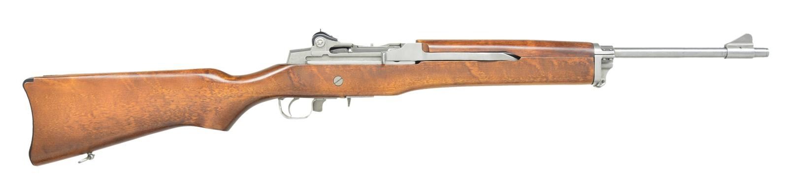 Cal. 223 Rem. S# 182-04099. Bbl. 18 1/2" w/ banded blade front sight plus factory receiver sight. Mfg. 1980 (1974 to date) w/ early matching wood handguard; walnut stained hardwood stock set. Carbine configured stock w/ black plastic buttplate & stainless sling swivels. MAGS: NONE; readily available from Ruger plus aftermarket in varying capacities (originally shipped w/ 5 rd.). CONDITION: all aspects near excellent w/ unfired appearance. (22-4099/NW). MODERN. $600-900.