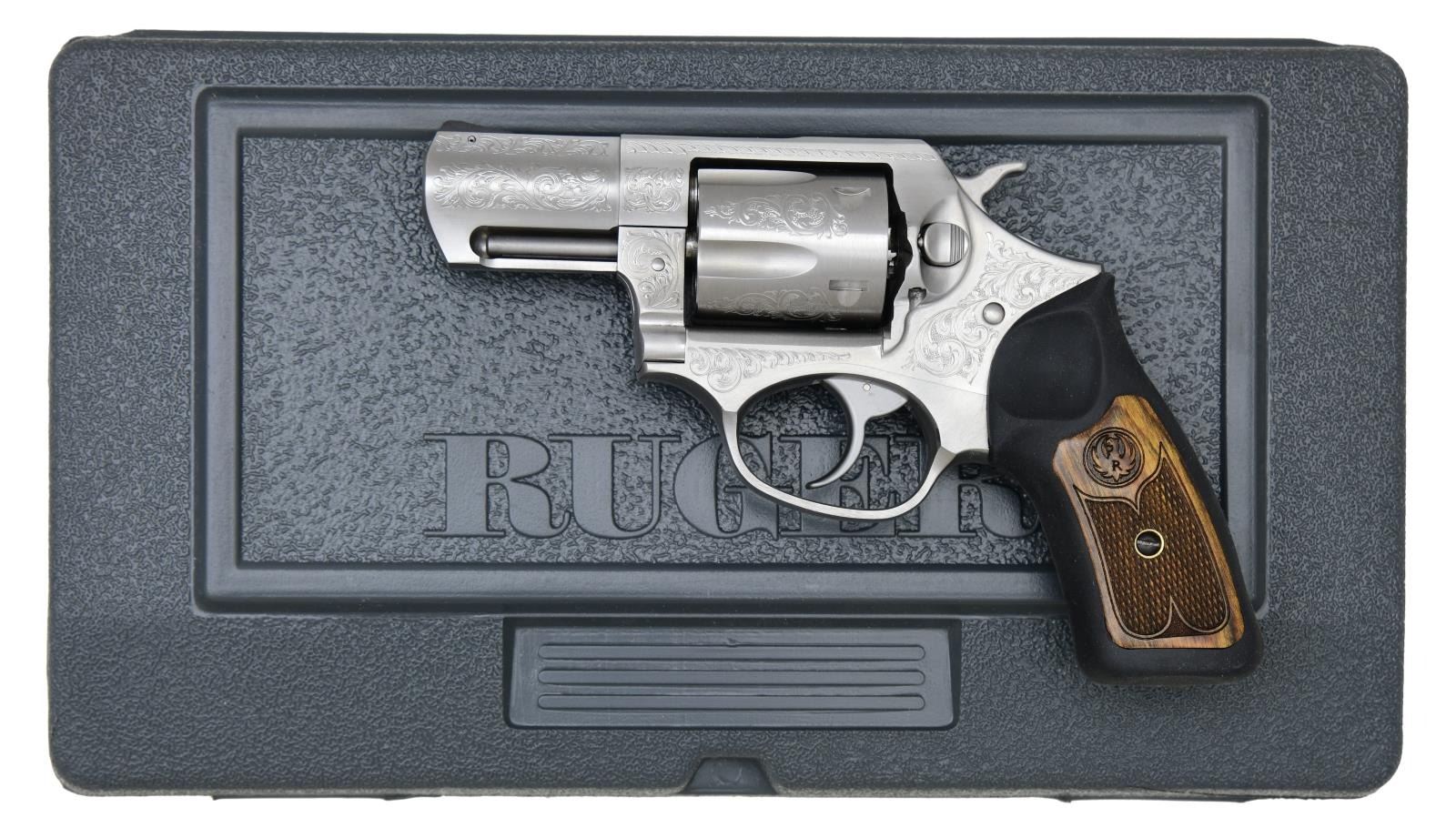 Cal. 357 Mag. S# 575-52959. Bbl. 2 1/4" with pinned, blued serrated blade sight; frame notched rear. Mfg. 2014 (1989 to date for all SP101's) as Model 05764 having catalogue designation KSP-321XEN. Exclusive offering by Talo Distributors having 80% engraved coverage done by Automated Finishing Co.; caliber on bottom of barrel shroud plus company marking on top of plain rib. "X" in model indicates longer frame suitable for any 357 Mag. cartridge whereas earlier "321" designation meant for 125 grain bullets only. Laminated hardwood grip panels with border checkering plus laser engraved Ruger logo set within factory rubber monogrip. UNATTACHED ACCESSORIES: matching numbered factory gray plastic case with packaging. CONDITION: all aspects near excellent appearing new and unfired. (24-6114/NW). MODERN. $800-1,200.