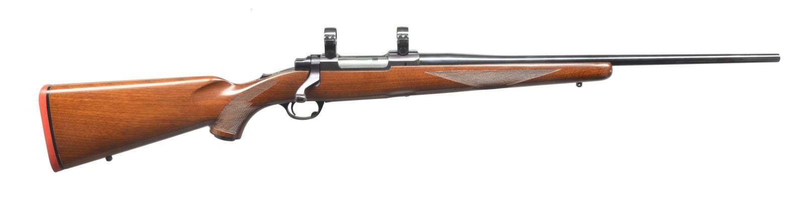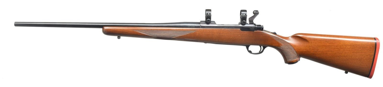 Cal. 250 Savage. S# 70-50015. Bbl. 22” rnd. made w/ out sights. Receiver is cut for Ruger rings, installed. Checkered stock & checkered pistol grip w/ black grip cap & Ruger emblem. Solid red Ruger recoil pad. Sling swivel studs included. Bolt has etched matching number. CONDITION: bbl. has good original blue w/ minor muzzle wear. Receiver has good original blue. Floorplate & trigger guard have good original finish. Stock has original finish w/ a few minor handling marks. Bore is good. (20-4154/BT). MODERN. $700-1,000.