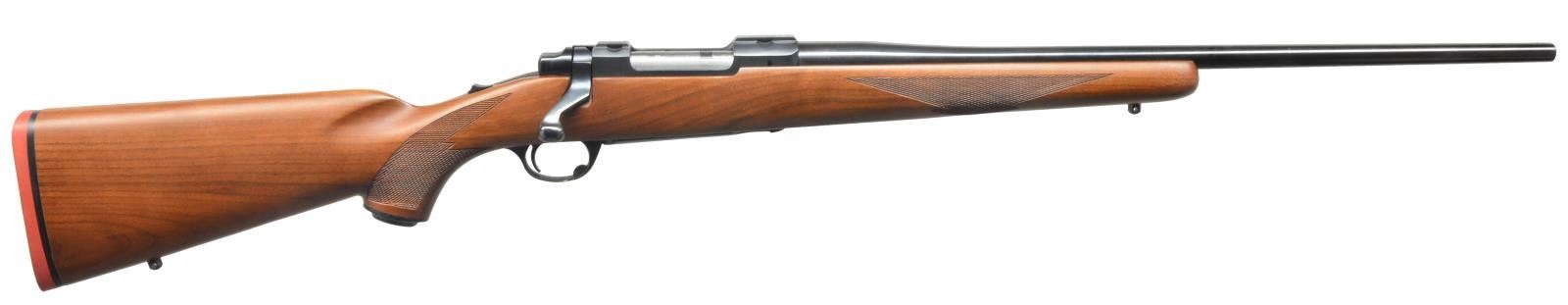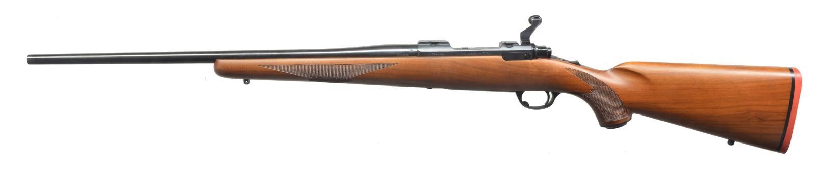 Cal. 6mm Rem. S# 70-50043. Bbl. 22” rnd. made w/ out sights. Receiver is cut for Ruger rings, which are w/ original red felt bag. Checkered stock. Checkered pistol grip w/ black hard rubber grip cap w/ Ruger emblem. Solid red Ruger recoil pad. Bolt has matching etched number. Tang safety. CONDITION: bbl. retains nearly all of original blue w/ just a few fine marks. Receive retains most of original blue w/ some faint sharp edge wear. Trigger guard & floorplate retain original finish w/ one minor scratch on bolt trigger guard. Stock has original finish w/ good checkering. Bore is good. (20-4184/BT). MODERN. $600-900.