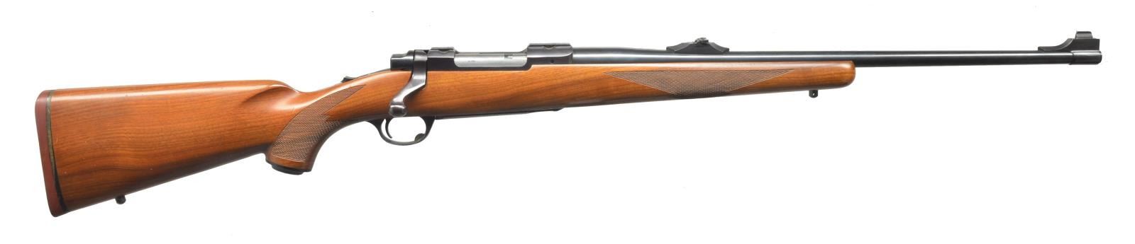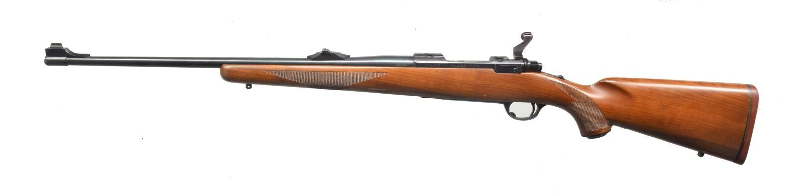 Cal. 243 Win. S# 70-48545. Bbl. 22” rnd. Banded front w/ bead sight. Screw on island rear w/ flip up adj. sight. Receiver cut for Ruger rings, not included. Checkered stock & checkered pistol grip. Black grip cap w/ Ruger emblem. Solid red Ruger recoil pad. CONDITION: bbl. has good original blue w/ a couple minor marks. Receiver has original blue w/ minor thinning on sharp edges. Floorplate & trigger guard has original finish w/ scuffing on trigger bow. Stock has original finish w/ some minor handling marks & light scratches. Bolt has matching etched S#. Bore is good. (20-4153/BT). MODERN. $500-800.