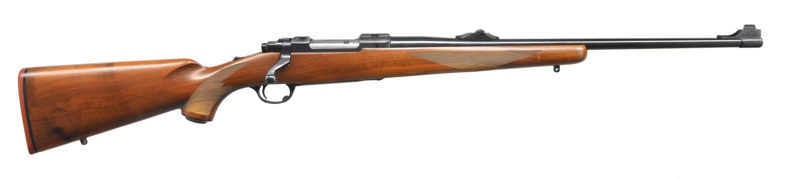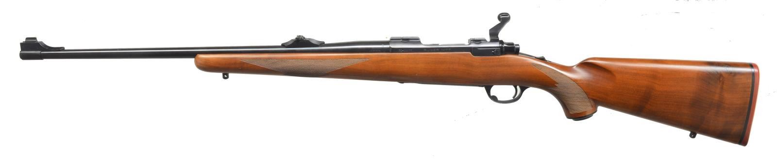 Cal. 308 Win. S# 70-20577. Bbl. 22” rnd. banded ramp front w/ bead sight & screw on island rear. Receiver cut for Ruger rings, not included. Checkered stock & checkered pistol grip. Black grip cap w/ Ruger emblem. Rounded Ruger recoil pad by Mershon. Bolt has etched matching number. CONDITION: bbl. has very good original blue w/ some minor discoloration at ramp. Receiver has good original blue w/ minor wear on sharp edges. Trigger guard & floorplate have original finish. Stock has original finish w/ just a few minor handling marks. Sling swivel studs included. Safety is not functioning. Bore is very good. (20-4150/BT). MODERN. $600-900.