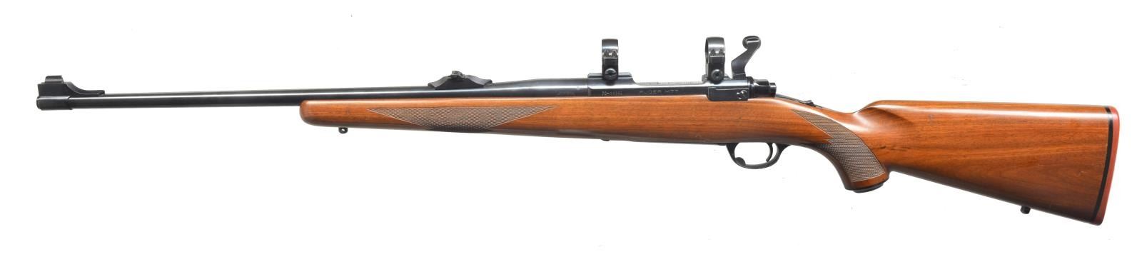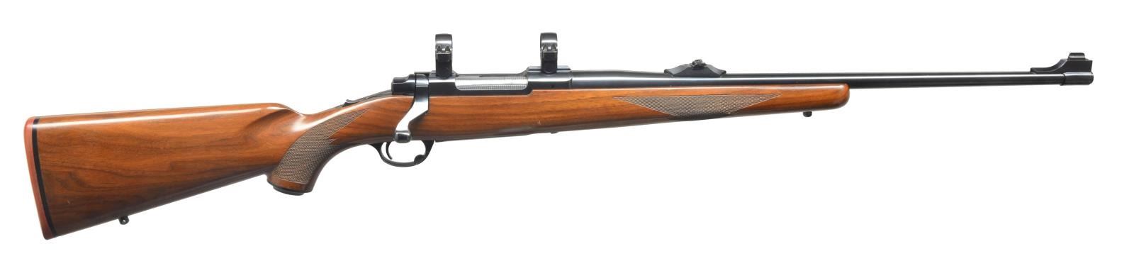 Cal. 308 Win. S# 70-04061. Bbl. 22” rnd. Banded ramp front w/ bead sight & screw on island rear w/ flip up adj. sight. Receiver is cut for Ruger rings, installed. Checkered stock & checkered pistol grip. Black grip cap w/ Ruger emblem. Rounded Ruger recoil pad by Mershon. Sling swivel studs included. CONDITION: bbl. has very good original blue w/ a couple of minor nicks & scratches. Receiver has good original blue w/ minor wear on sharp edges. Trigger guard & floorplate have original finish, faded on floorplate. Stock has original finish w/ a few minor handling marks & good checkering. Bolt body has been engine turned. Bore is good. (20-4151/BT). MODERN. $600-900.