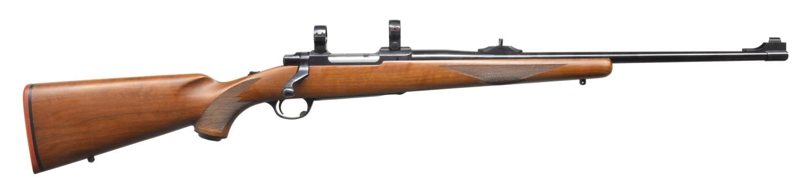 Cal. 284 Win. S# 70-30464. Bbl. 22” rnd. Banded ramp front w/ bead sight & screw on island rear w/ flip up adj. sight. Receiver cut for Ruger rings, installed. Checkered stock & checkered pistol grip. Black grip cap. Red rounded Ruger recoil pad by Mershon. Bolt has etched matching number. CONDITION: bbl. retains most of its original blue w/ a couple sm. spots of surface oxidation. Receiver retains most of its original blue w/ wear on sharp edges. Floorplate & trigger guard have most of their original finish. Stock has original finish w/ minor handling marks & good checkering. Bore is good. (20-4157/BT). MODERN. $600-900.