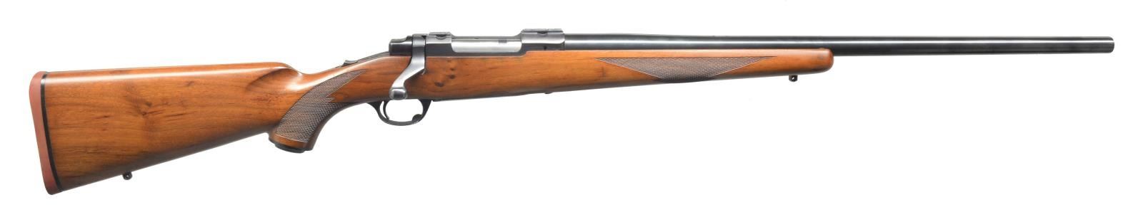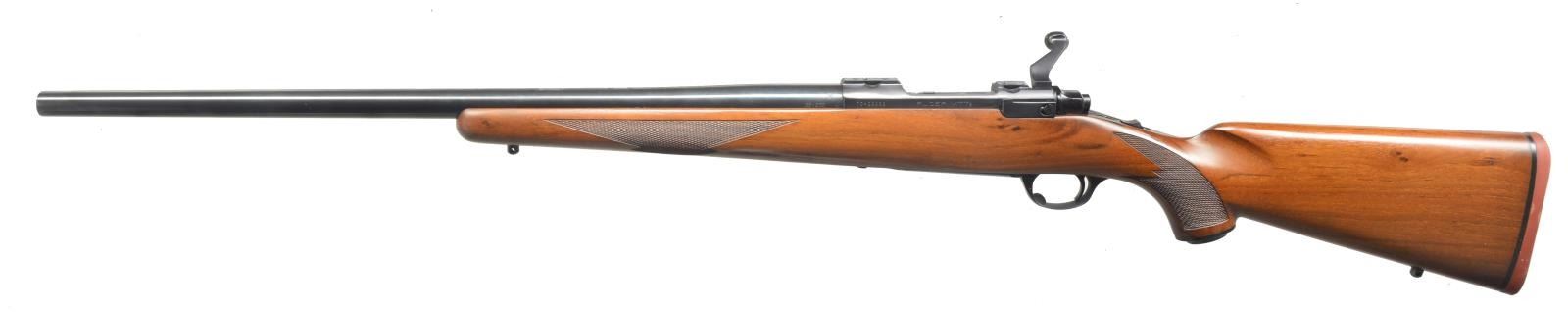 Cal. 22-250. S# 70-38686. Bbl. 24” varmint weight bbl. Bbl. is drilled for target base w/ filler screws. Receiver is cut for Ruger rings w/ front being driven through target base w/ filler screws. Checkered stock & checkered pistol grip. Black grip cap w/ Ruger emblem. Solid red Ruger recoil pad. Sling swivel studs included. Bolt has matching etched number. CONDITION: bbl. retains very good original blue w/ minor muzzle wear. Receiver retains very good original blue w/ minor thinning on sharp edges. Floorplate & trigger guard have very good original finish w/ a minor spec on floorplate. Stock has good original finish w/ minor handling marks & good checkering. Bore is good. (20-4155/BT). MODERN. $600-900.