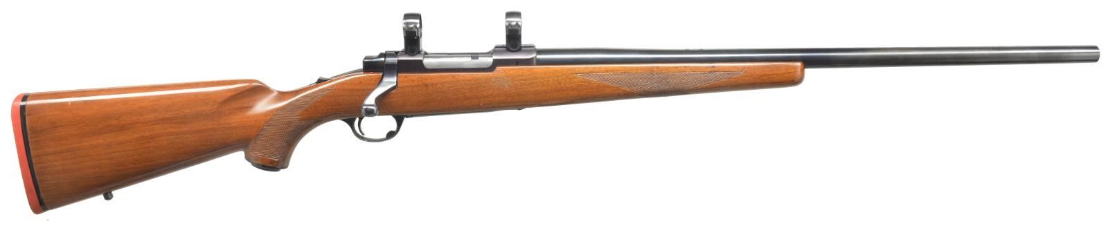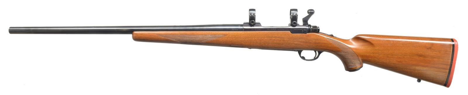 Cal. 243 Win. S# 70-90289. Bbl. 24" heavy made w/ out sights. Bbl. is drilled for target lock w/ filler screws. Receiver cut for Ruger rings, installed. Front base is drilled for target base w/ filler screws. Checkered stock & checkered pistol grip. Black grip cap w/ Ruger emblem. Red Ruger recoil pad. Sling swivel stud in rear missing in forend. Bolt has etched matching number. CONDITION: bbl. has good original blue w/ a few rub marks & thinning to gray patina about 6" behind muzzle. Receiver has good original blue w/ minor wear on sharp edges. Floorplate & trigger guard have good finish w/ some minor scratches & wear on sharp edges. Stock has added coat of finish w/ some minor handling marks. Bore is good. (20-4163/BT). MODERN. $600-900.