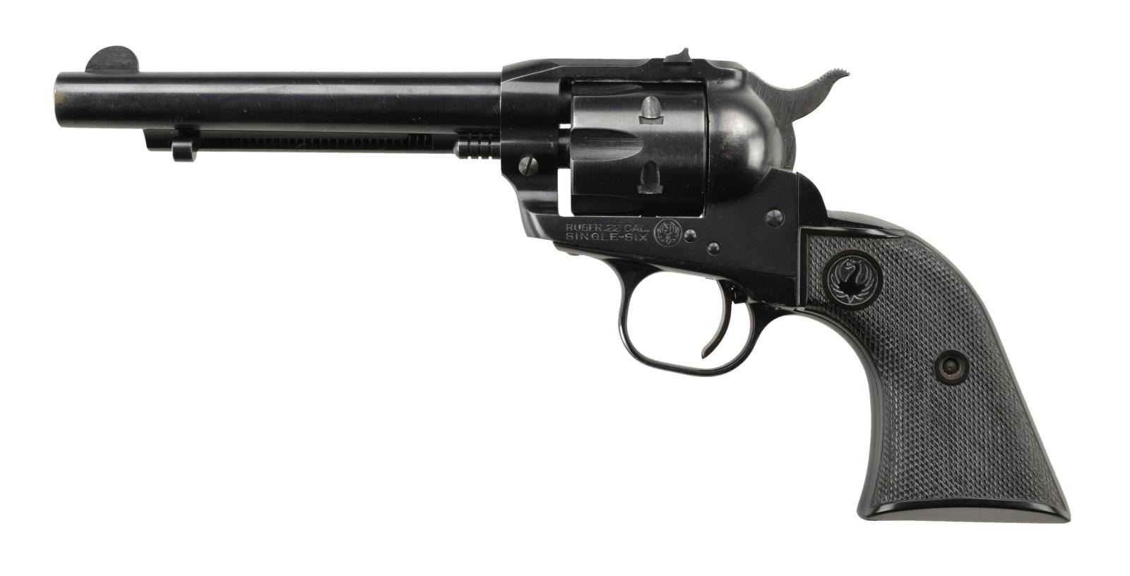 Cal. 22 LR. S# 53759. Bbl. 5 1/2" w/ serrated faced blade sight; drift adj. rear. Mfg. 1956 w/ all correct features including: offset ejector housing, dimpled ejector rod head, capped base pin latch, thin trigger, checkered hard rubber grips & not factory safety updated. CONDITION: very good plus collector grade original finish w/ slight thinning on end of ejector housing & left side of bbl. at muzzle. Near excellent bore & grips. (22-2659/NW). CURIO. $450-650.