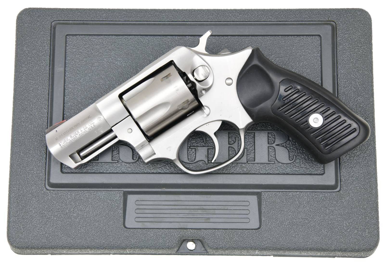 Cal. 38 Spl. S# 572-62843. Bbl. 2 1/4" fully shrouded with pinned blade; frame notched rear. Mfg. 2005 as Model 05701 (KSP821) and sold to the French government; later returned to Ruger, who repackaged them and sold them with a "Used Gun" tag through Lipsey's Distributors. Approximately 10,000 were made (S# 572-45559 to 572-62977) with a discrete lanyard loop at the base of the backstrap and French proofs on the frame, barrel, and cylinder. Standard rubber grip with grooved black plastic inserts is modified to function with the lanyard loop. The factory website lists the caliber as "38 Spl. +P". UNATTACHED ACCESSORIES: matching numbered gray plastic case with test-fired cartridge and packaging. CONDITION: very faint cylinder turn line, slight firing residue, and front sight alteration (top filed and orange paint added); balance is near excellent, including bore and grip assembly. (23-6887/NW). MODERN. $800-1,200.