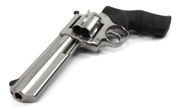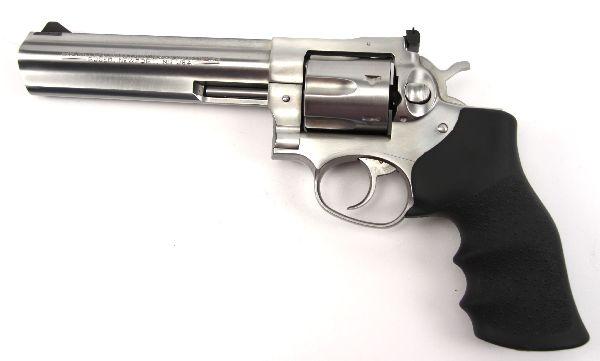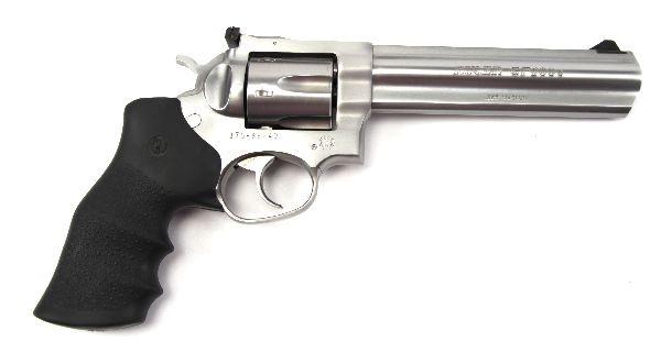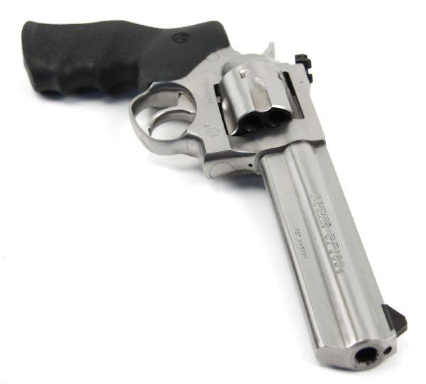 Ruger GP100 .357 Magnum revolver. Stainless steel finish, with 6 inch barrel, and rubber grips. Bore is bright and clean, finish and grips very good. Original plastic case and paperwork are included. Overall very good condition. SN: 17588240 Caliber: .357MAG Serial #: 17588240