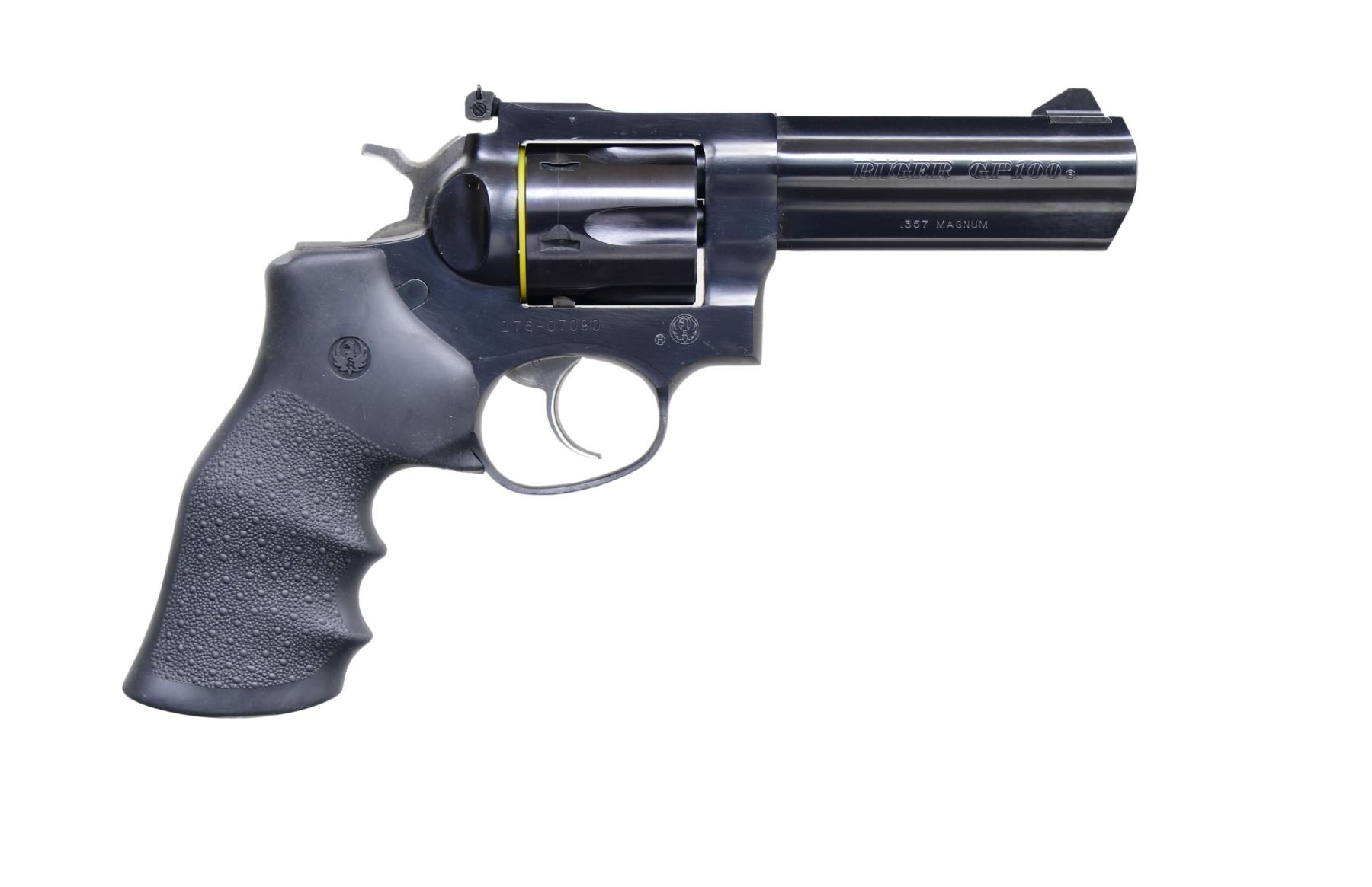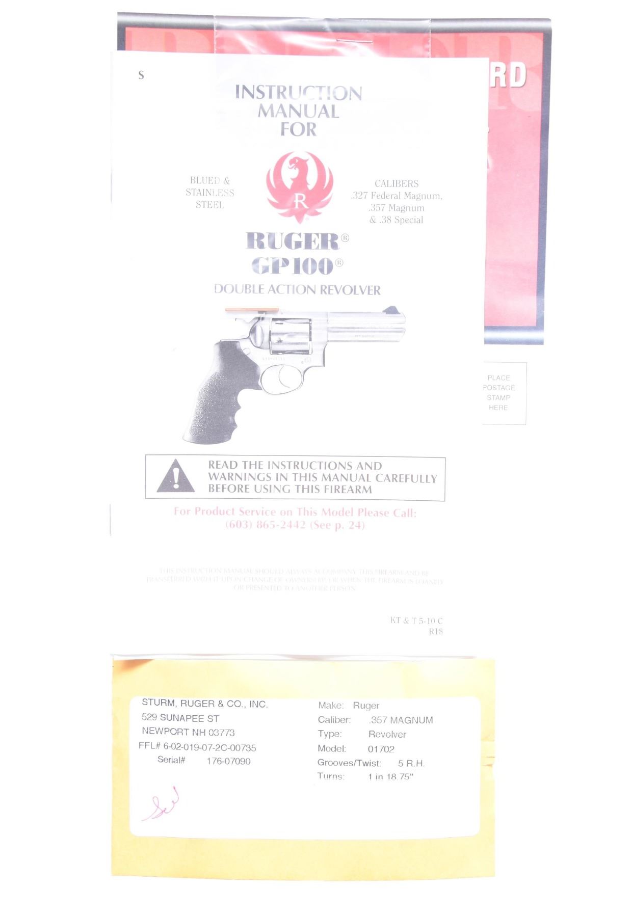 Cal. 357 Mag. S# 176-07090. (2011) MODEL 01702 Catalog No. GP-141. The Ruger GP100 is a double action revolver featuring a blued finish. The barrel length is 4.2 inches with a ramp front sight and an adjustable rear sight. It has black rubber grips with finger grooves. The frame is a standard Ruger frame without special naming. The cylinder holds six rounds and is fluted. UNATTACHED ACCESSORIES: Factory box and instruction manual. CONDITION: The revolver is in near excellent overall condition with 98% of its original finish remaining. The barrel retains 98% of its blued finish. The frame also retains 98% of its blued finish. The grips are in excellent condition. The bore is bright and shiny with strong rifling. (24-2945/MD). MODERN. $350-550.