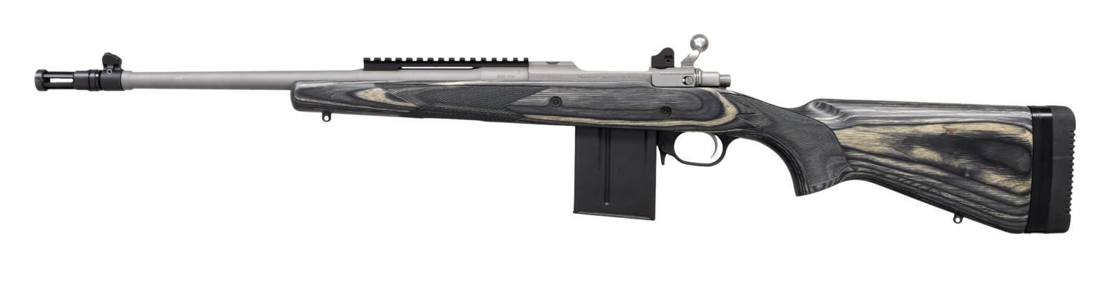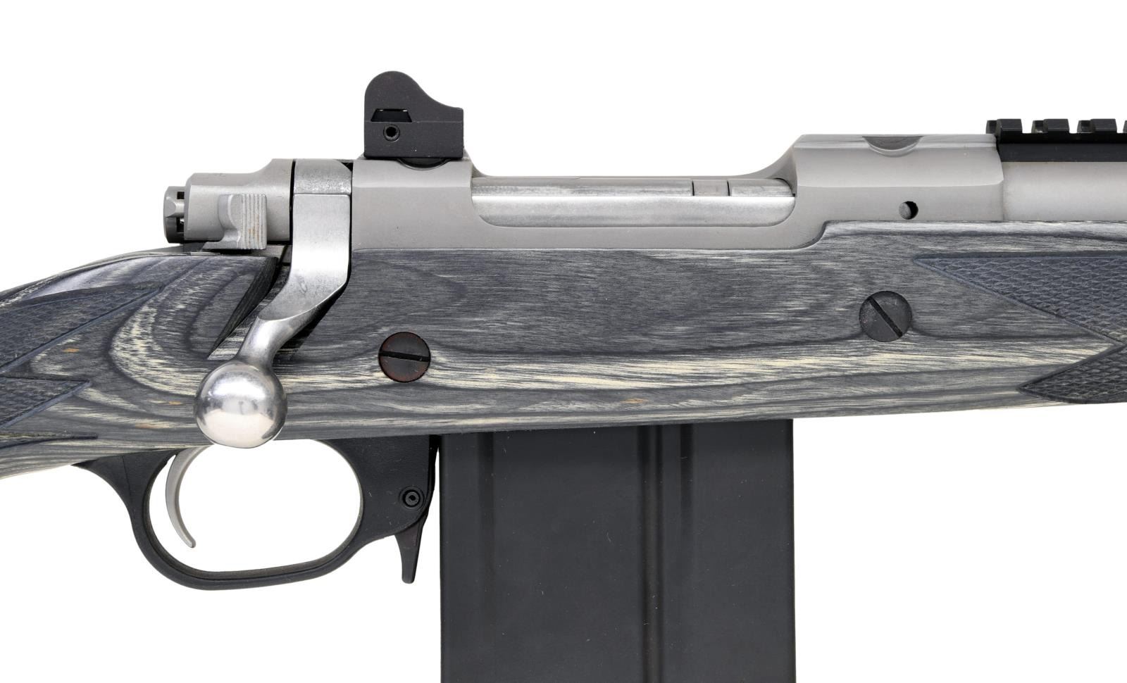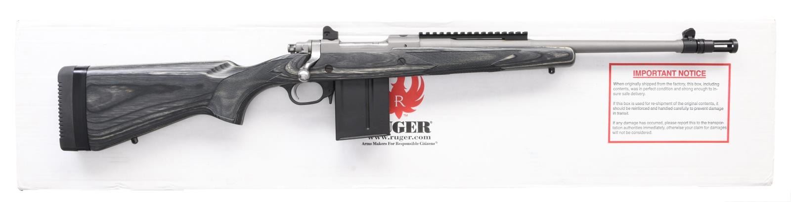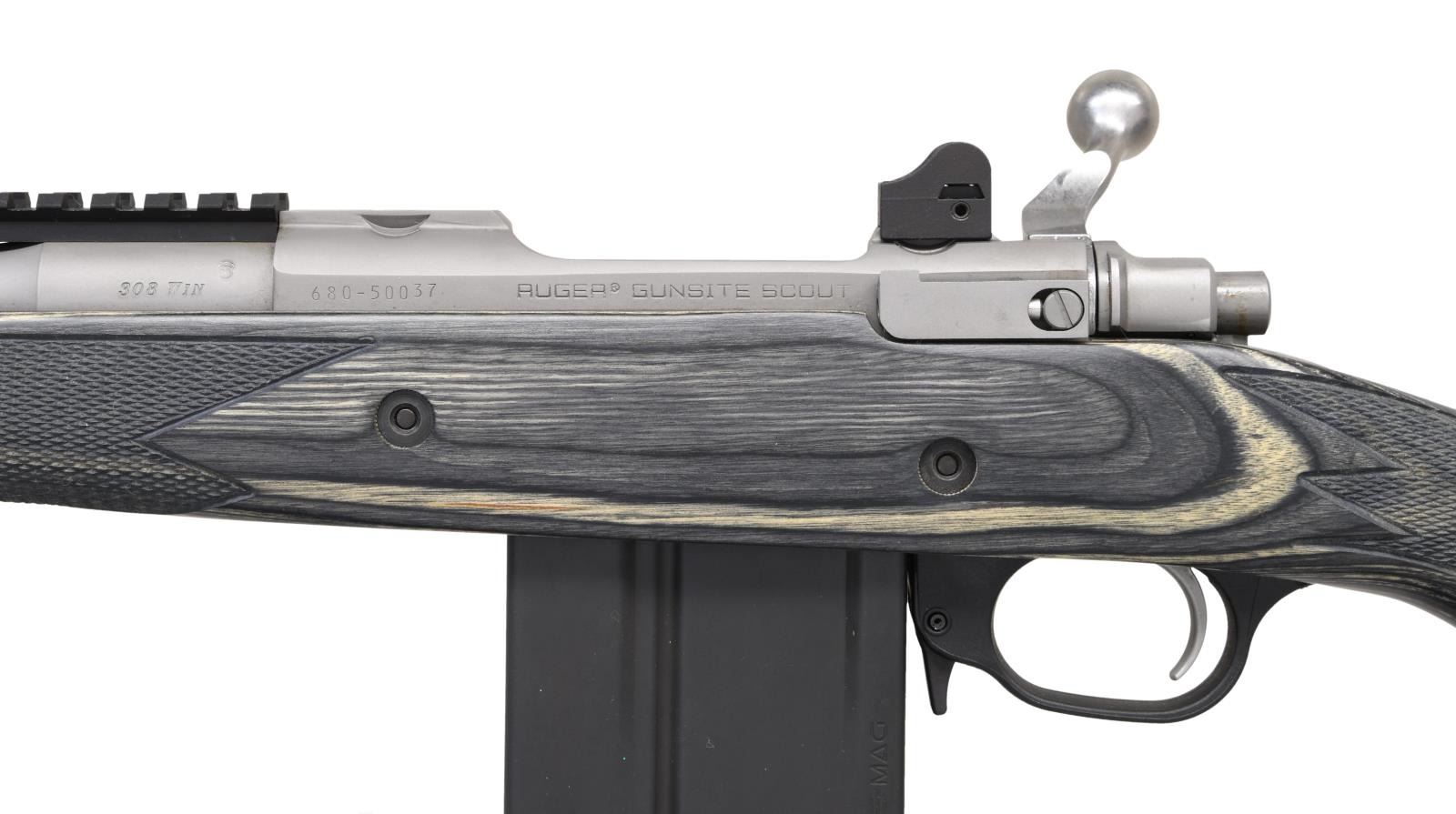 MATCHING FACTORY BOX. Cal. 308 Win. S# 680-50037. Bbl. 17". Gunsite Scout bolt action rifle mfg. by Ruger in 2013. Top of the bbl. is marked with Ruger's mfg. information, with the cal. designation marked on the left at the breech. Left side of the receiver is marked with the S#, followed by "RUGER GUNSITE SCOUT". Receiver and bbl. exhibit a matte gray finish, with the front sight and bird cage flash hider exhibiting a blue finish and the bolt body and handle exhibiting a polished in-the-white finish. Checkered gray laminated wood pistol grip buttstock with black polymer trigger guard and black rubber recoil pad. Blade front sight with aperture rear sight. MAGS: 1 10-rd. steel ACCURATE-MAG. UNATTACHED ACCESSORIES: matching factory box. CONDITION: near new, with metal components retaining bountiful amounts of their original factory finishes, exhibiting few superficial handling marks overall. Mirror bore, exhibiting well-defined rifling throughout. Stock is excellent. Box shows some mild exterior wear but otherwise remains sturdy and serviceable. (23-6313/MLW). MODERN. $500-800.