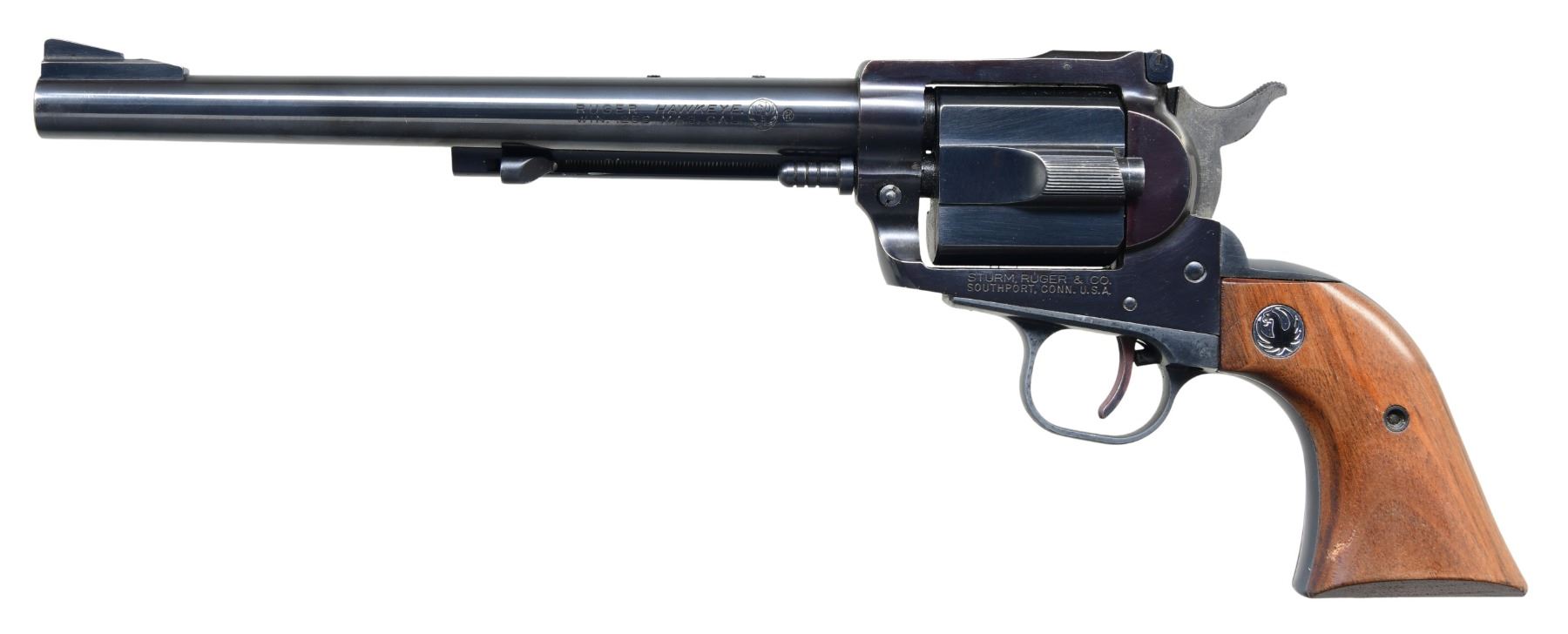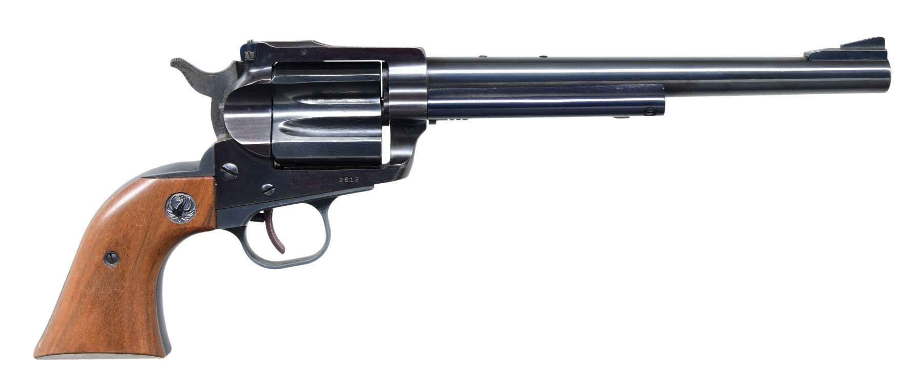 Cal. 256 Win Mag S# 2512 Blued finish, produced from 1963 to 1964. Barrel length 8.5 inches. Adjustable rear sight and ramp front sight. Single shot with rotary breechblock. Smooth wood grips with Ruger medallions. CONDITION: Overall excellent. Barrel retains approximately 95% of original finish with minimal wear. Frame retains about 90% of original finish with minor handling marks. Grips are in excellent condition with minimal wear. Bore is bright with strong rifling. CURIO (23-6275) $1,500 - $2,000