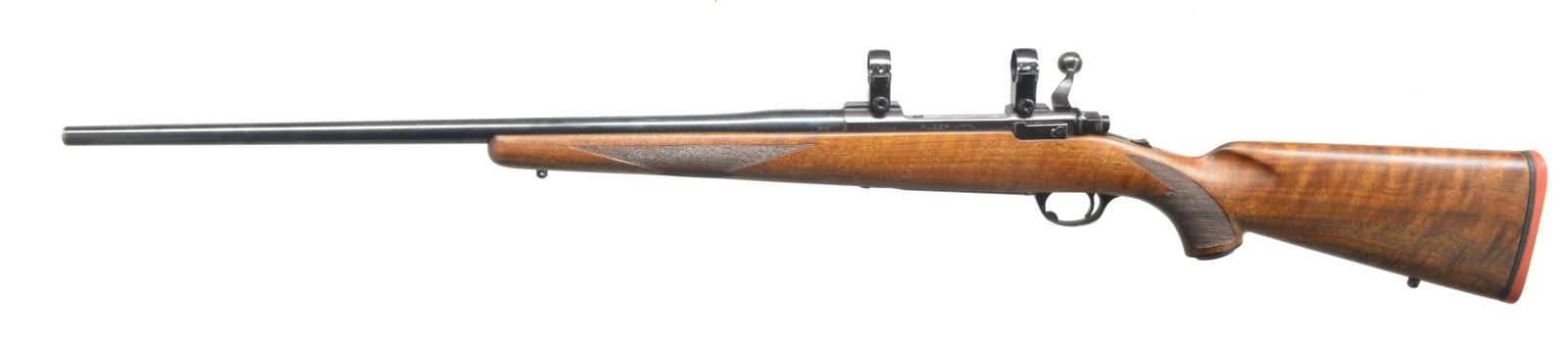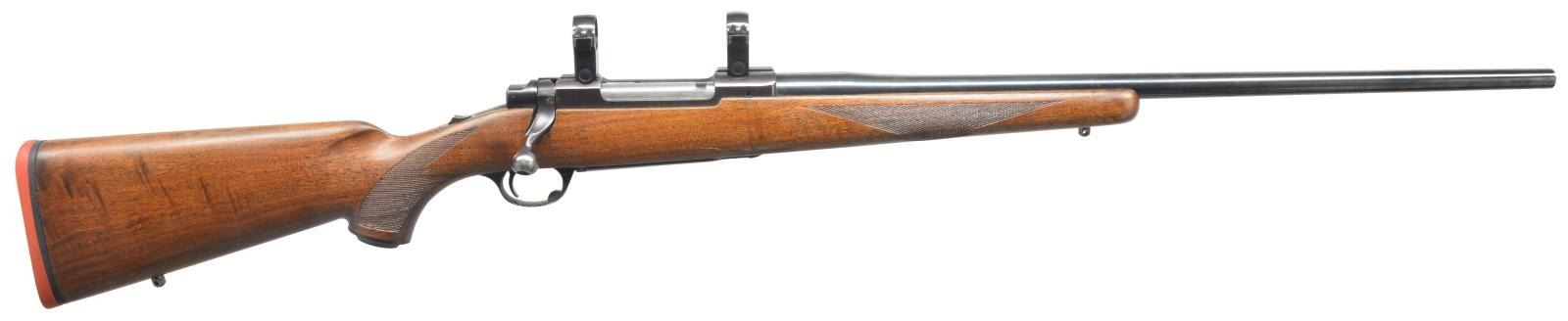 Cal. 25-06. S# 70-38894. Bbl. 24” rnd. made w/ out sights. Receiver cut for Ruger rings included. Checkered stock. Checkered pistol grip w/ black grip cap w/ Ruger emblem & solid red Ruger recoil pad. Sling swivel studs included. Bolt has matching etched number. CONDITION: trigger guard & floorplate have numerous scratches. Stock has a clean finish w/ a few minor scratches. Bore has a few scattered pits. (20-4173/BT). MODERN. $600-900.