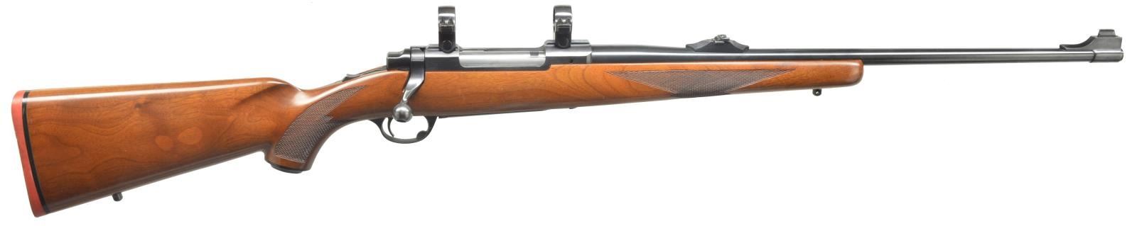 Cal. 270 Win. S# 70-32722. Bbl. 22” rnd. Bbl. band front ramp w/ gold bead front sight & screw on base w/ flip up adj. rear sight. Receiver cut for Ruger rings, attached. Checkered stock. Checkered pistol grip w/ black hard rubber grip cap & Ruger emblem. Solid red Ruger recoil pad. Sling swivel studs included. Bolt has etched matching number. CONDITION: bbl. retains most of original blue w/ some minor muzzle wear. Receiver has original blue w/ thinning on sharp edges. Trigger guard & floorplate have most of their original finish. Stock has original finish w/ some minor rub marks on left side. Checkering is good. Bore is good. (20-4174/BT). MODERN. $600-1,000.