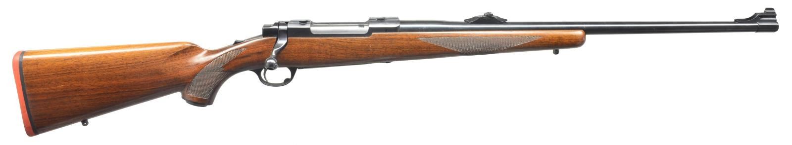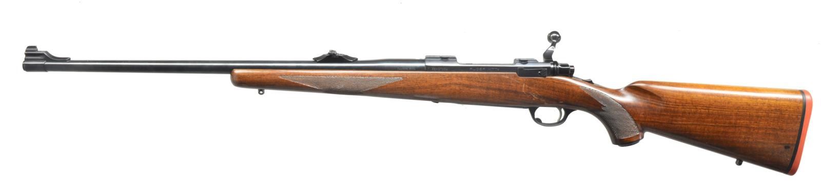 Cal. 7mm Rem. Mag. S# 70-37351. Bbl. 23” rnd. Banded rib front w/ bead sight. Screwed on island base w/ flip up adj. sight. Receiver cut for Ruger rings (not included). Checkered stock. Checkered pistol grip w/ black grip cap & Ruger emblem. Solid red Ruger recoil pad. Sling swivel studs included. CONDITION: bbl. retains good original blue w/ some thinning behind front sight & some minor surface oxidation marks. Receiver has good original blue w/ minor sharp edge wear. Floorplate & trigger guard have original finish w/ 2 minor nicks. Stock has coat of added finish w/ numerous nicks & scratches. Bore has scattered putting. (20-4175/BT). MODERN. $600-900.
