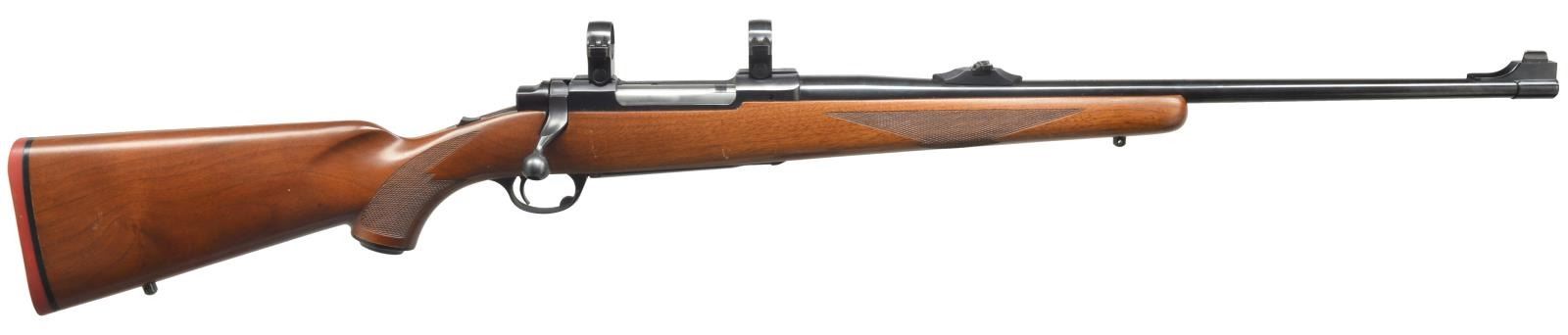 Cal. 7x57. S# 70-44716. Bbl. 22” rnd. Banded front w/ bead sight. Screwed on island rear w/ flip up adj. sight. Receiver cut for Ruger rings, installed. Checkered stock & checkered pistol grip. Black grip cap w/ Ruger emblem. Solid red Ruger recoil pad. Sling swivel studs installed. CONDITION: bbl. retains most of original blue w/ some minor thinning on front sight. Receiver retains most of original blue w/ wear on sharp edges. Floorplate & trigger guard retain original finish w/ one minor mark. Stock has original finish. Stock retains original finish w/ some light nicks & dings. Good checkering. Bolt has matching etched number. Bore is good. (20-4180/BT). MODERN. $600-900.