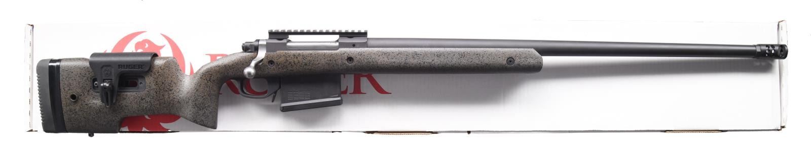 RIFLE WITH MATCHING FACTORY BOX. Cal. 300 Win Mag. S# 712-43435. Bbl. 25 3/4". M77 Hawkeye Long-Range Target bolt action rifle mfg. by Ruger in 2018. Top of the bbl. is marked with Ruger's mfg. information, with the cal. designation marked on the left at the breech. Left side of the receiver is marked with the S#, followed by "RUGER M77 HAWKEYE". Metal components exhibit a matte black finish overall. Brown laminated wood buttstock with black speckling features an adj. length of pull, a 2-way adj. comb, as well as an M-LOK rail on the underside of the forearm. Threaded bbl. is fitted with a Ruger Hybrid muzzle brake. MAGS: 1 5-rd. UNATTACHED ACCESSORIES: matching factory box. CONDITION: near new, with metal components retaining virtually all of their original factory finish overall. Brilliant mirror bore, exhibiting grease and well-defined rifling throughout. Stock is excellent overall. Box shows some mild exterior wear but otherwise remains sturdy and serviceable. (23-6430/MLW). MODERN. $500-900.