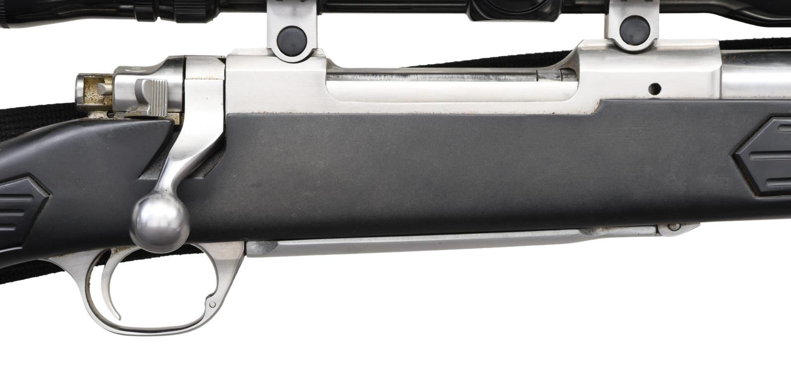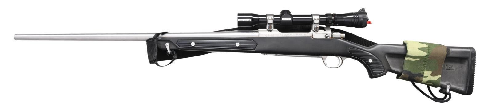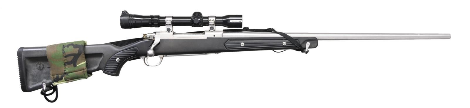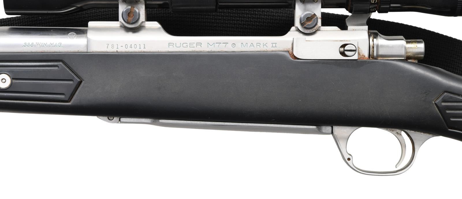 Cal. 338 win Mag. S# 781-04011. Bbl. 24". M77 Mark II bolt action rifle mfg. by Ruger in 1992. Top of the bbl. is marked with Ruger's mfg. information, with the cal. designation marked on the left at the breech. Left side of the receiver is marked with the S#, followed by "RUGER M77 MARK II". Metal components exhibit a stainless steel finish overall. Black polymer buttstock with black grooved polymer grip panels. Receiver is mounted with a Redfield Lo-Pro 2-7x scope. CONDITION: metal components retain bountiful amounts of their original factory finish, exhibiting some superficial handling marks overall. Mirror bore, exhibiting well-defined rifling throughout. Stock shows some light marks from handling and storage, but otherwise remains sturdy and serviceable. Scope retains a clear optic. (23-6511/MLW). MODERN. $500-700.