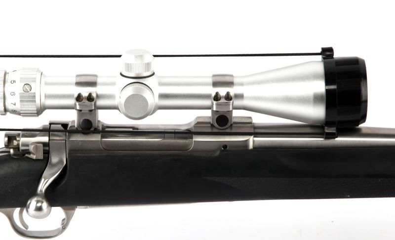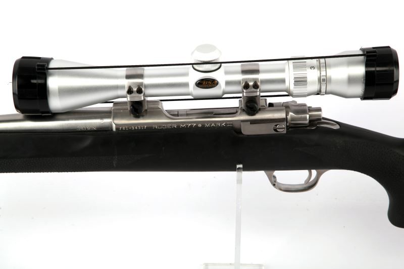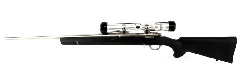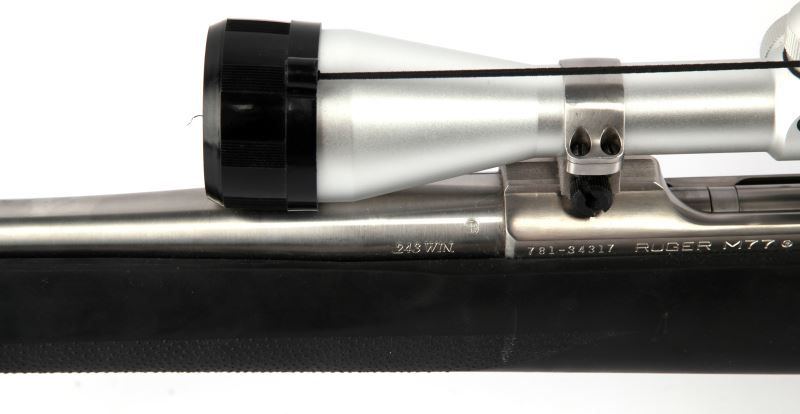 Ruger M77 Mark II sporting rifle, chambered in .243 Winchester. Stainless steel finish, with Hogue rubberized overmold stock, and BSA 3-9x optics. Bore is bright and clean, finish is 95%, and stock is very good. Overall excellent condition. Caliber: .243 Win. Serial #: 781-34317