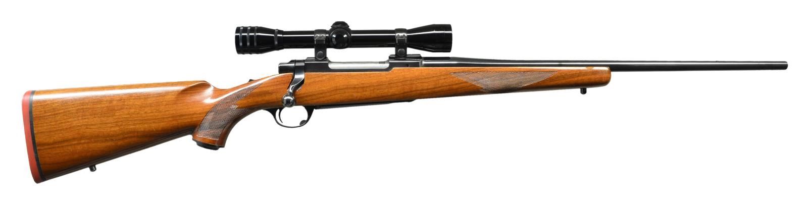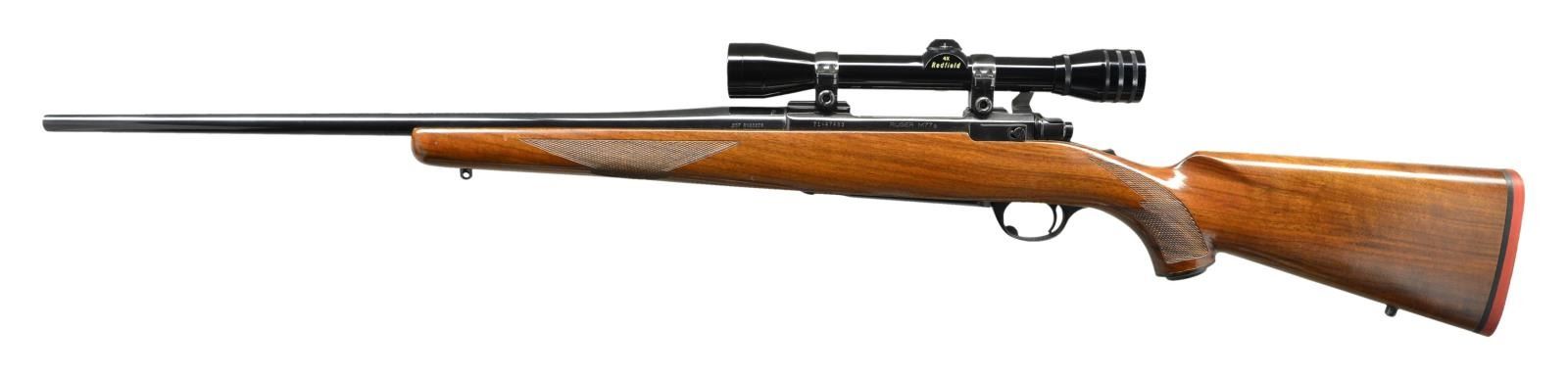Cal. 257 Roberts. S# 71-47483. Bbl. 22" w/out provision for sights. Mfg. 1975 w/ receiver factory machined for Ruger rings (slotted screws replaced w/ Allen head screws) holding Redfield gloss finished duplex reticle 4X scope. Desirable tang safety, no "warning marks" plus checkered walnut stock set w/ grip cap, red pad & sling studs. UNATTACHED ACCESSORIES: original red scope box. CONDITION: very good plus overall condition w/ sm. dent on right front of forend. Near excellent metal finish, bore & scope set.. (22-3255/NW). MODERN. $450-650.