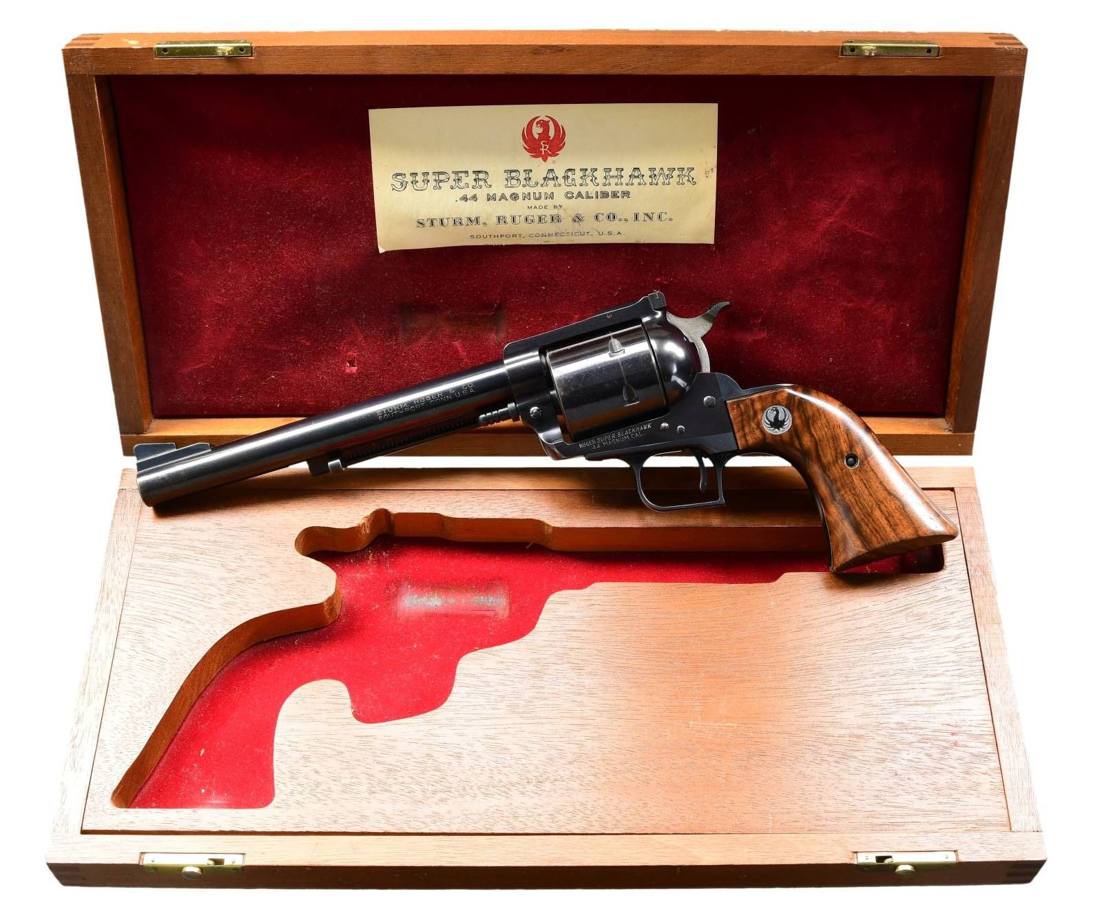 RUGER MAHOGANY CASED OM SUPER BLACKHAWK REVOLVER.