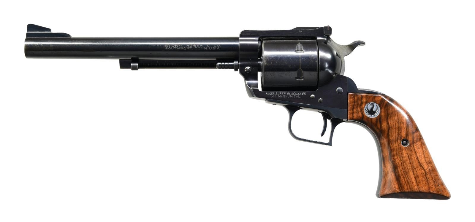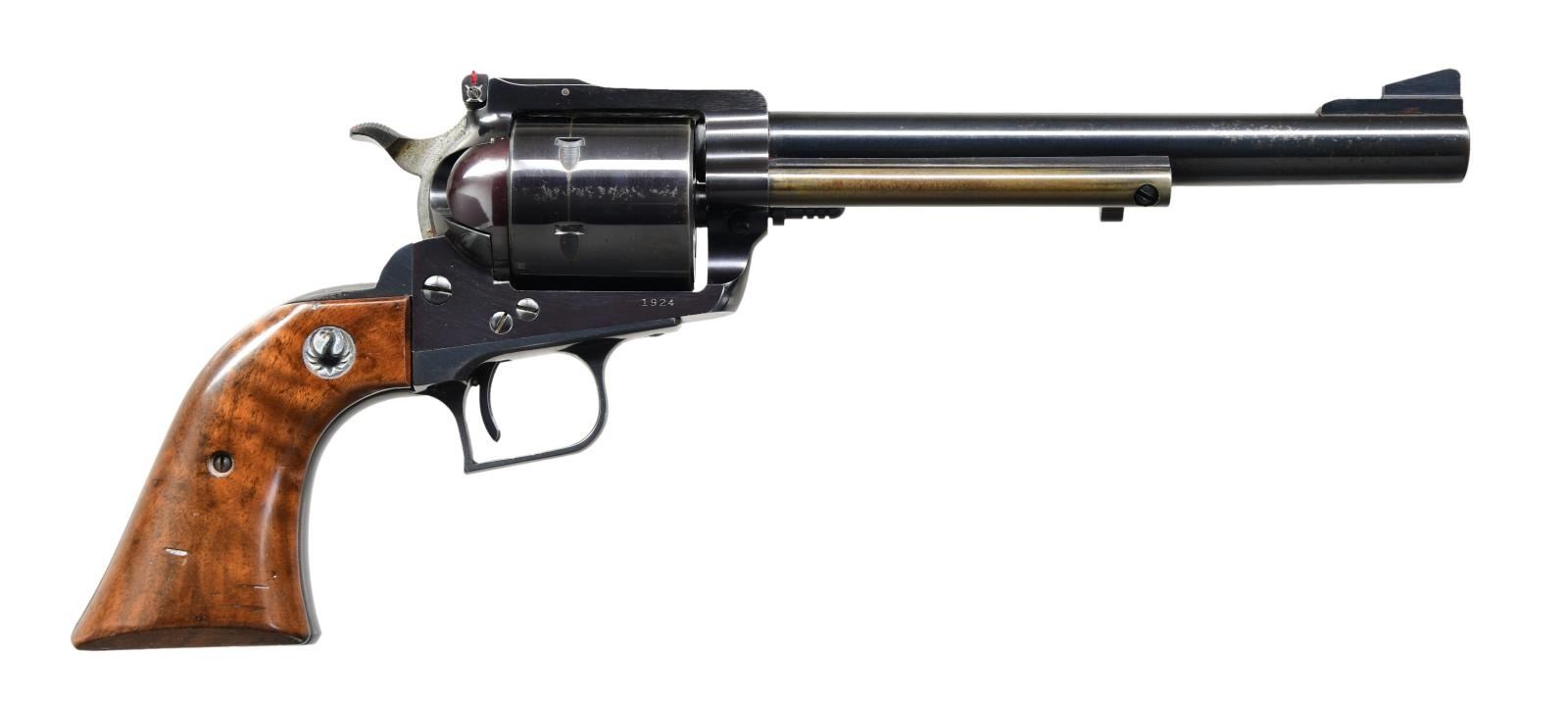 Cal. 44 Mag. S# 1924. Bbl. 7 1/2" with ramped base having serrated blade plus Micro adjustable rear on cylinder frame. Mfg. 1960 (1959-1973) with all steel construction including Dragoon style standard length grip frame having smooth varnished grips of high grade walnut; black eagle medallions. Barrel is without "INC." and eagle logo. Original lock work without factory safety update. UNATTACHED ACCESSORIES: very good (minor marks on top of lid) correct presentation case marked "GENUINE MAHOGANY" on its bottom. Interior with red velour (Ruger label under lid) and mahogany revolver cut out; hinges and latches are natural brass. CONDITION: very good appearance with outer rounded edge of ejector housing having even finish loss plus patina appearance. Sides of barrel and cylinder have mottled appearance likely from contact with (damp?) cloth lining. Light cylinder turn line. Very good grips with minor handling marks. Near excellent bore. (23-6688/NW). CURIO. $800-1,200.