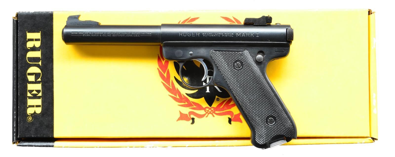 Cal. 22 LR. S# 16-68127. Bbl. 5 1/2" bull w/ undercut target front sight. Adj. rear sight. Mfg. 1980. Blued finish. Checkered black grips w/ silver Ruger medallions. MAGS: 1-10 rd. unmarked. UNATTACHED ACCESSORIES: cardboard sleeve marker numbered to gun, yellow factory box & paperwork. CONDITION: grips rate very good plus w/ light handling wear. Metal retains 98% original blue w/ spots of dried preservative grease. Near excellent bore. (22-4289/MJC). MODERN. $200-300.