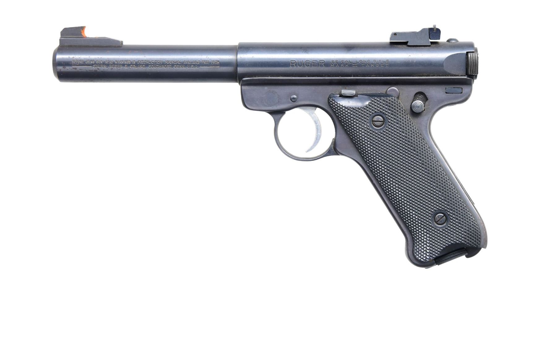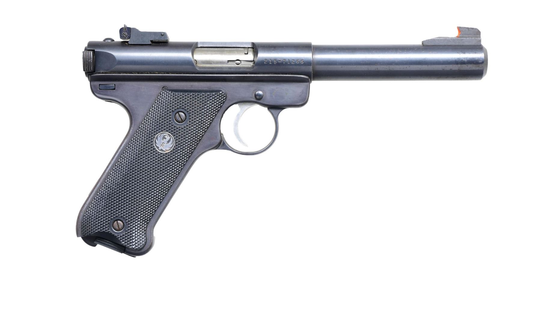 Cal. 22 LR. S# 215-71266 (mfg. 1991). This example features a blued finish with a 5.5" bull barrel. Target patridge front sight with added red paint and adjustable rear sight. The left side of the slide is marked "RUGER 22 CAL. LONG RIFLE MARK II TARGET," and the right side bears the Ruger logo and manufacturing address. The frame is of standard configuration with checkered black plastic grips featuring the Ruger emblem. MAGS: one 10 Rd. CONDITION: near excellent overall, with approximately 95% of the original blued finish remaining, showing some pinprick oxidation. The bore is bright with sharp rifling. (24-4451/MD). MODERN. $250-350.