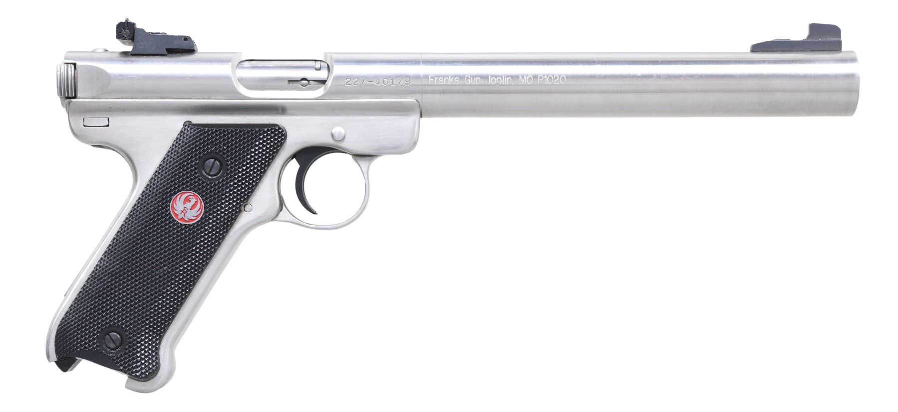 INTEGRAL FRANKS GUN SILENCER. Cal. 22 LR. S# (Silencer): P1020, (Pistol): 22740179. Bbl. 7 7/8" (with silencer). Ruger Mark III Target semi-automatic pistol mfg. by Ruger in 2006, and subsequently fitted with a Franks Gun integral silencer. Left side of the receiver is marked with the model and cal. designations, with the S# marked on the right. Right side of silencer is marked "Franks Gun Joplin, MO P1020". Receiver, frame, and silencer exhibit a polished in-the-white finish. Frame is mounted with 2-piece Ruger medallion checkered black plastic grips. Blade front sight, with adj. square notch rear sight. Mag. is absent. CONDITION: very good, with scattered superficial marks from handling and storage present overall. Silencer shows some carbon build up front prior use, but is otherwise very good overall. Grips show some smoothing, as well as some scattered marks from handling and storage, but otherwise remain sturdy and serviceable. PROVENANCE: From the Estate of Ivan Lee Shapiro. (03-1790 / 24-6518/MLW). MODERN / MODERN CLASS III. $700-1,000.