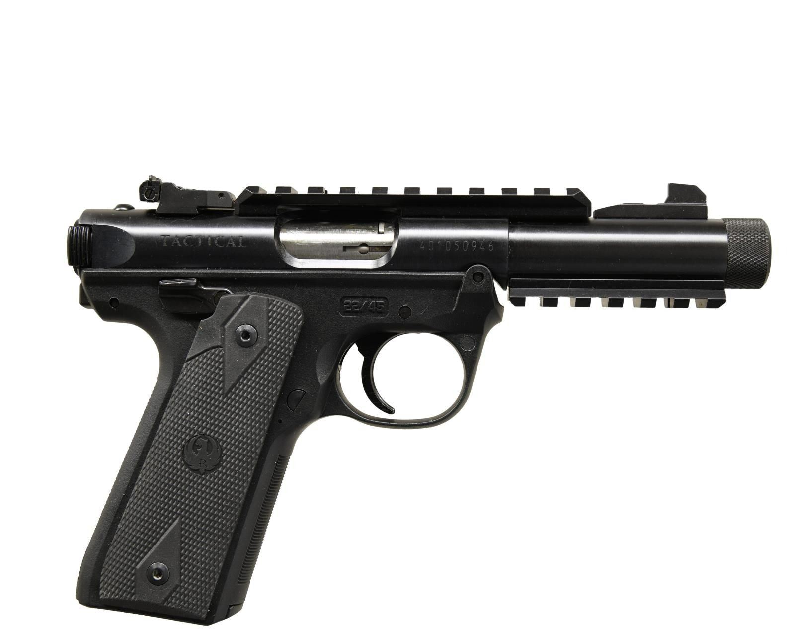 Cal. 22 LR. S# 401050946. Bbl. 4.4" hammer forged bull threaded 1/2"-28 with knurled thread protector. Mfg. 2017 in Prescott, AZ as blued Model 40149 with screw attached front sight and adjustable rear. Picatinny rails factory installed on receiver and bottom of barrel. Checkered rubber 1911 style Ruger logo grips retained by Allen screws. Ergonomic bolt stop and ambidextrous safety that can be converted to left only with included washer. Push button magazine release and takedown assembly. Polymer frame having grooved and checkered grip straps. Magazine safety. MAGS: 2 drop free 10 rd. UNATTACHED ACCESSORIES: original box with packaging. CONDITION: all aspects near excellent, appearing new and unfired. (23-6099/NW). MODERN. $300-450.