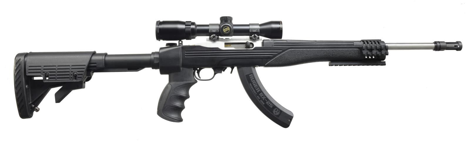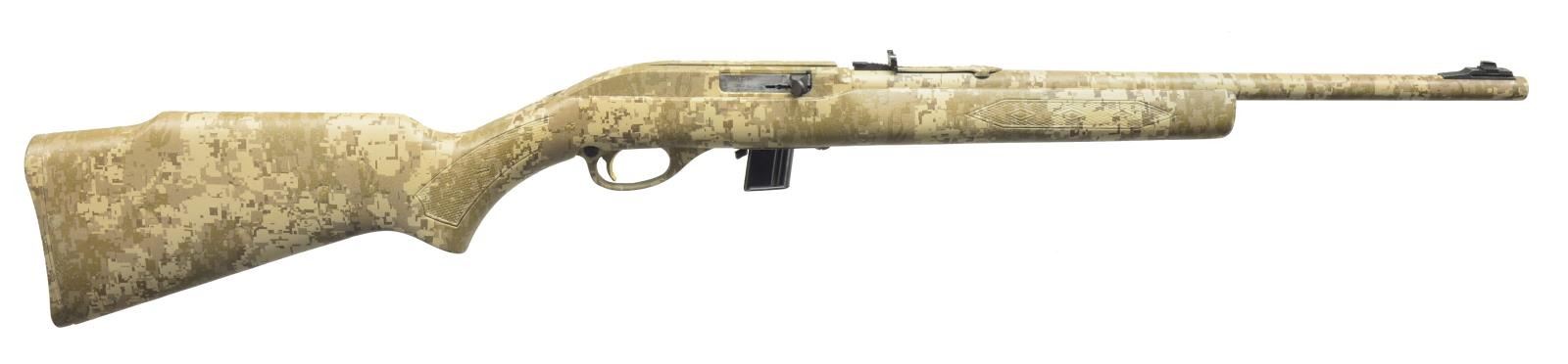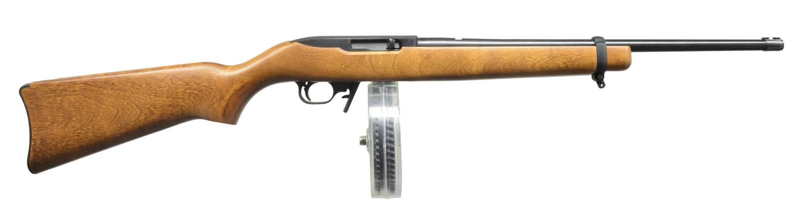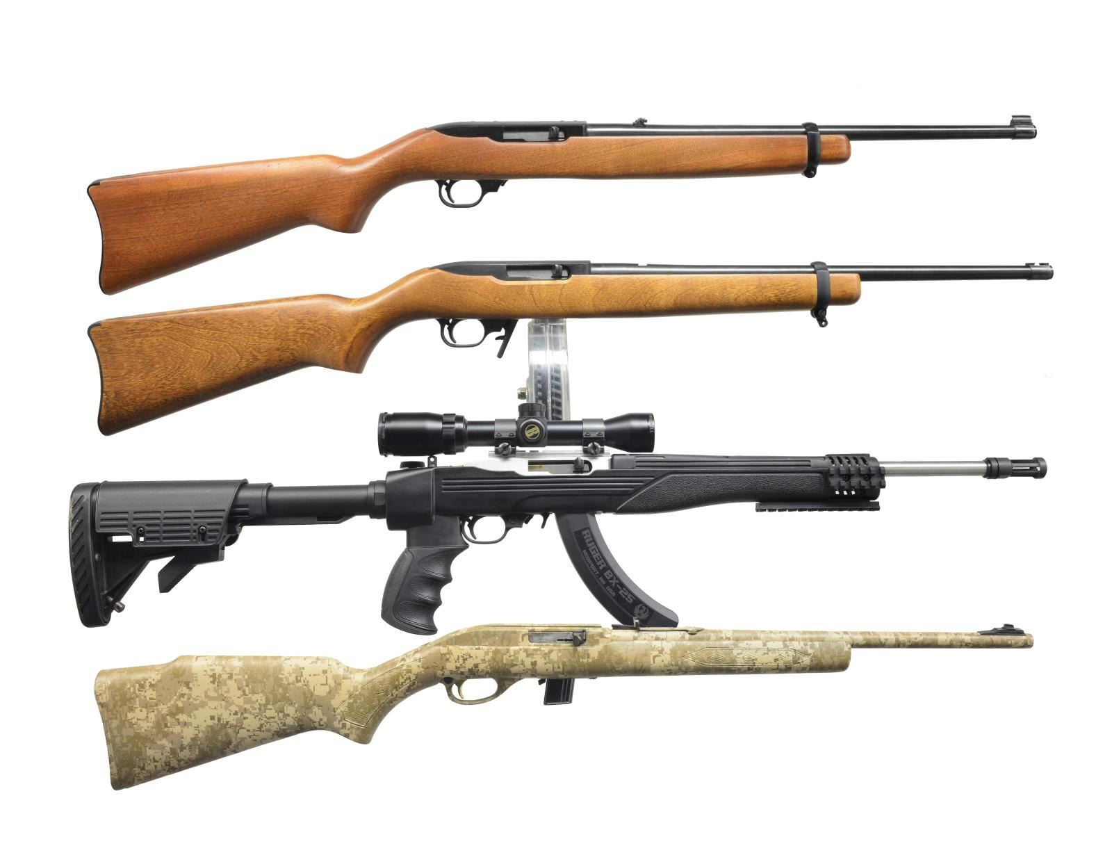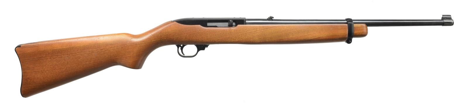 1) RUGER MODEL 10/22 CARBINE. Cal. 22 LR. S# 115-00797. Bbl. 18 1/2". Band front w/ dovetail bead sight & dovetail flip up adj. rear sight. Uncheckered stock carbine buttplate. Top of receiver is drilled for scope mount. MAGS: 1 Ruger marked 10 rd. UNATTACHED ACCESSORIES: Ruger box w/ non matching number containing accessories. CONDITION: bbl. has original blue w/ a few light scratches. Receiver has original black w/ thinning on sharp edges. Stock has original finish w/ some minor handling marks. Bore is good. (20-3584/BT). 2) RUGER 10/22 CARBINE. Cal. 22 LR. S# 236-80659. Bbl. 18 1/2" rnd. Vacant front sight dovetail & vacant rear dovetail. Uncheckered hardwood stock w/ carbine buttplate. Bbl. band has sling swivel attached. MAGS: 1 50 rd. drum mag. CONDITION: bbl. retains good original blue w/ some areas of fine surface oxidation. Receiver retains its original black w/ minor wear on sharp edges. Stock has original stain finish w/ some minor nicks & dings. Bore is good. (20-3597/BT). 3) STAINLESS STEEL RUGER 10/22 CARBINE. Cal. 22 LR. S# 820-23703. Bbl. 18" stainless w/ flash hider. No front or rear sight. Top of receiver has rail installed w/ Weaver scope rings holding a Bushnell Banner 1.5-4.5 w/ duplex reticle. Tactical collapsing stock. Stock has 3 rails at front for mounting lasers & lights. MAGS: 1 Ruger BX 25 rd. CONDITION: stainless bbl. has a few handling marks between forend & flash hider. Stainless colored receiver has a few handling marks. Black synthetic aftermarket stock has original finish. Bore is bright. (20-3601/BT). 4) MARLIN MODEL 995. Cal. 22 LR. S# 20580900. Bbl. 18" rnd. Screw on ramp front sight w/ dovetail bead & dovetail adj. rear sight. Receiver is grooved. Checkered stock. Checkered pistol grip. Marlin hard rubber buttplate. Gun has been digitally camouflaged. MAGS: 1 unmarked 7 rd. CONDITION: finish is good. Bore has scattered fine pitting. (20-3965/BT). ALL MODERN. $400-800.