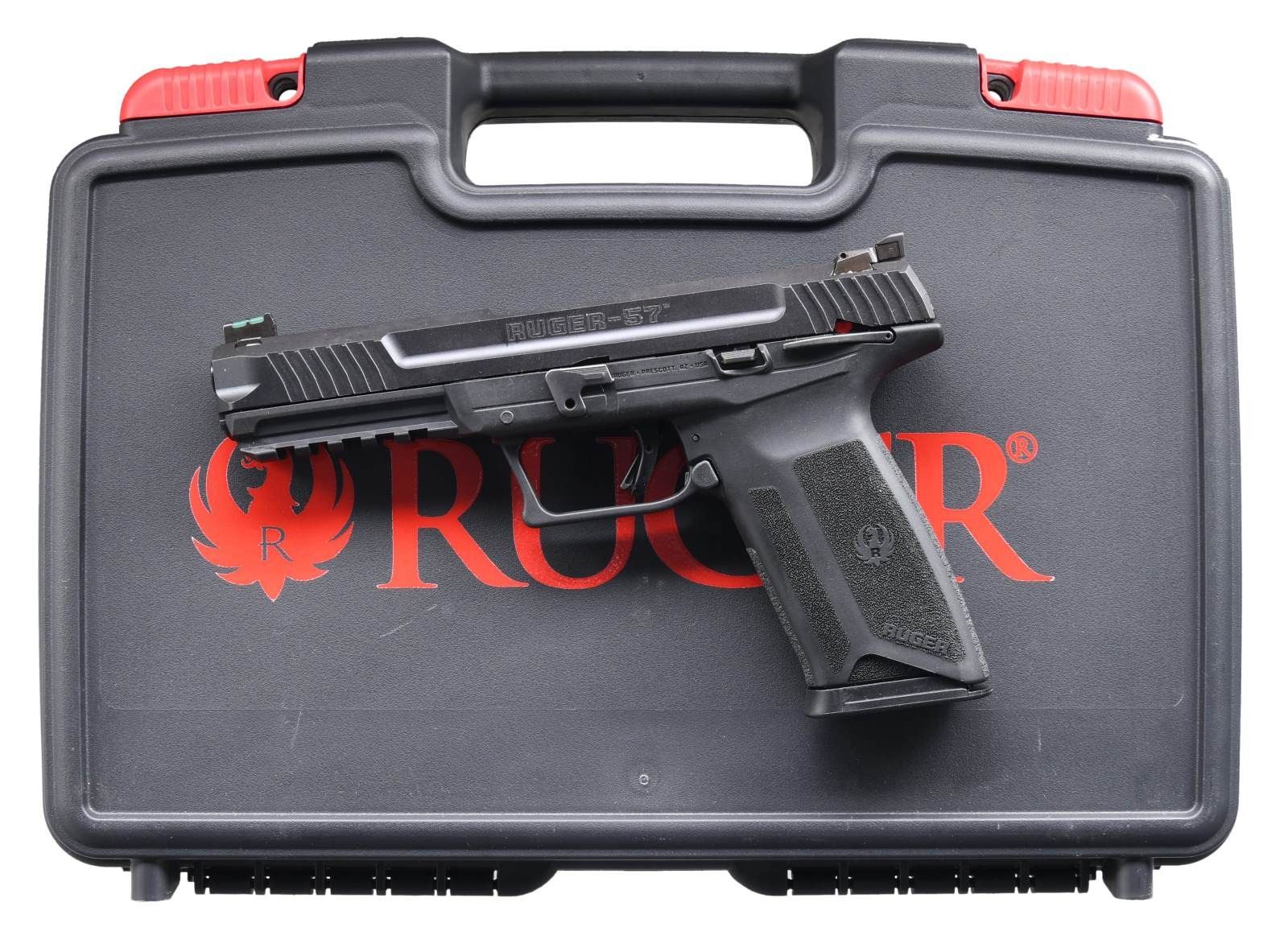 Cal. 5.7X28. S# 641-04323. Bbl. 4.94" with black Nitride finish. Mfg. 2020 (2020 to date) in Prescott, AZ as Model 16402 having high performance (black) glass filled nylon (checkered) frame and black oxide finished slide (factory drilled and tapped for addition of optical sights). Internal hammer ignition, accessory rail, ambidextrous thumb safety, trigger bar safety plus dovetailed sights (green fiber optic front and fully adjustable rear). MAGS: 3 TOTAL (all factory): 2 originally packaged with pistol of 10 rds. plus 1 extra of 20 rds. UNATTACHED ACCESSORIES: original factory case and packaging. CONDITION: all aspects near excellent including bore. (23-6168/NW). MODERN. $450-650.