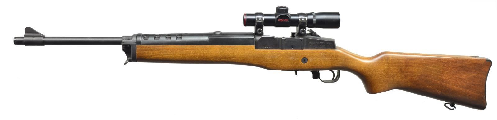 Cal. 7.62 x 39. S# 197-05933. Bbl. 18 1/2". Mfg. 2003 w/ blued finish, black synthetic ventilated handguard & walnut stained hardwood stock having black plastic carbine buttplate plus swivels. Patterned after Mini-14 Ranch Rifle in popular 7.62X39 cal. deemed more efficient for medium game hunting. Receiver machined for Ruger rings holding Simmons 2.5X duplex reticle scope. Standard blade front sight & folding aperture rear. MAGS: 10 TOTAL: factory 5 rd.; new in package factory 20 rd.; 2-10 rd. w/ factory style bases; 2 made in USA waffle pattern plastic Pro-Mag. 20 rd.; 2 ribbed AK style appearing 25 rd.; 1 ribbed AK style 30 rd. w/ USA marked floorplate & 1 ribbed AK style 40 rd. w/ green follower. CONDITION: all aspects near excellent except light marks on scope exterior at bottom of turret & windage cap. (21-1179/NW). MODERN. $600-850.