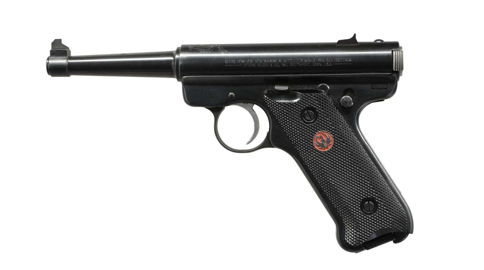 Cal. 22 LR. S# 222-46468. Bbl. 4 3/4". Mfg. 1999 as MK-II commemorating 50 years of Ruger. Checkered black plastic grips with silver eagle medallions having red backgrounds. Commemorative marking over chamber and eagle logo on back of stainless bolt. Fixed sights and silver trigger. MAGS: factory 10 rd. with medallion on base that match grips. CONDITION: very good to excellent with peppery oxidation on gripstraps plus small mark in front of serial number. Near excellent bore and grips. (23-1505/NW). MODERN. $250-350.