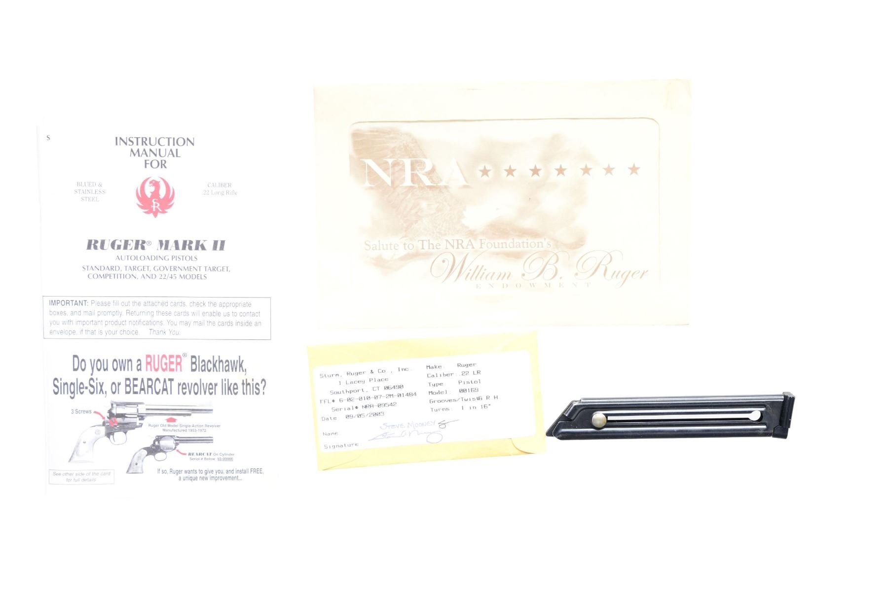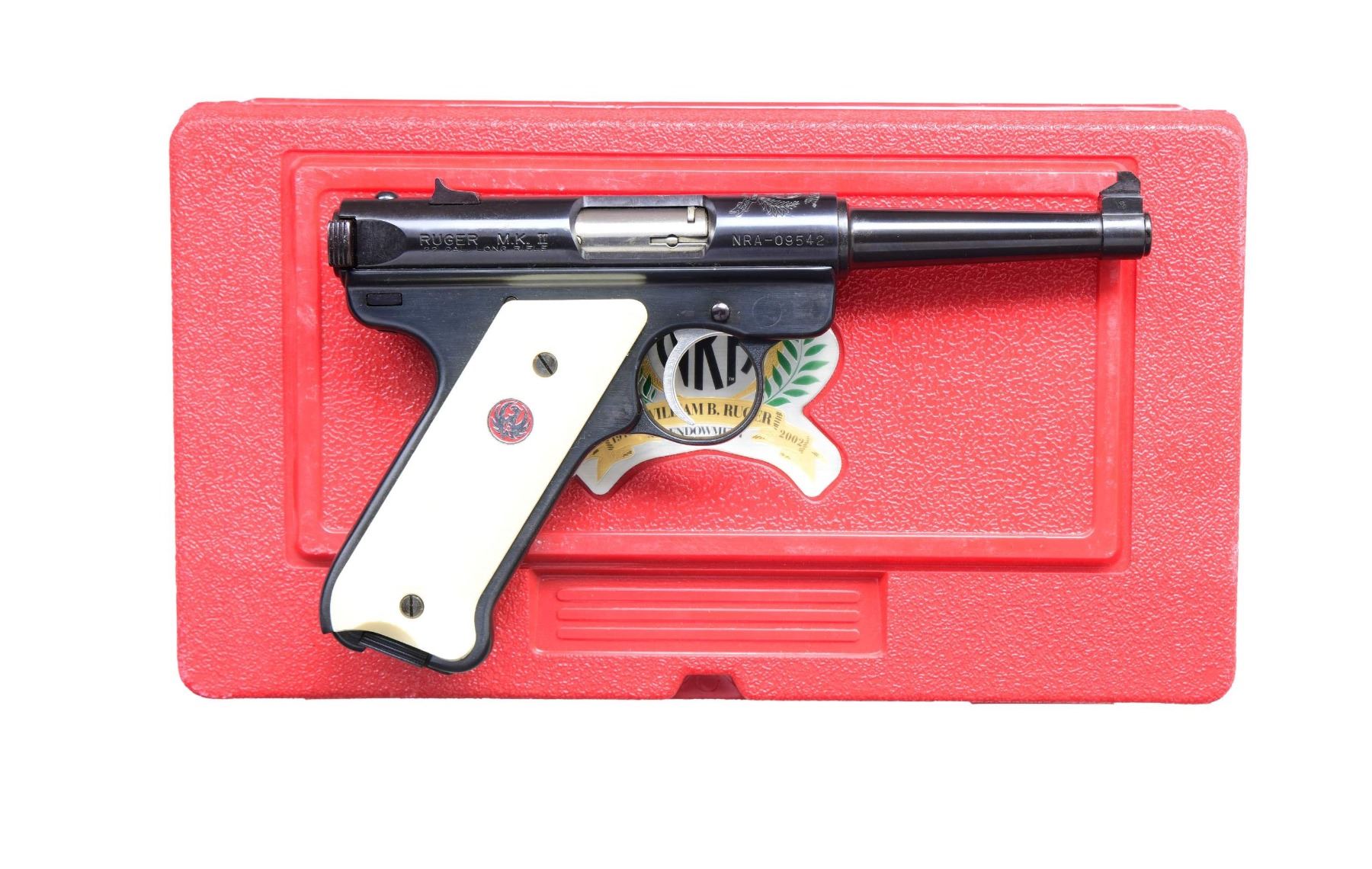 MARK II SEMI AUTO PISTOL WITH MATCHING FACTORY MODEL 0169 BOX. CAL. 22 LR S# NRA-09542 (2003). Top of receiver has William B Ruger signature along with Ruger & NRA endowment crest; bolt face has Ruger emblem. Blued finish with 4.75 inch barrel. Fixed blade front sight and notch rear sight. Checkered white polymer grips with red Ruger medallions. MAGS: 2-10 Rds. UNATTACHED ACCESSORIES: Factory case, manual, and NRA certificate. CONDITION: Overall excellent condition with 98% original finish on slide and frame. Bore is bright with sharp rifling. MODERN (24-4458/MD) $350-$500.