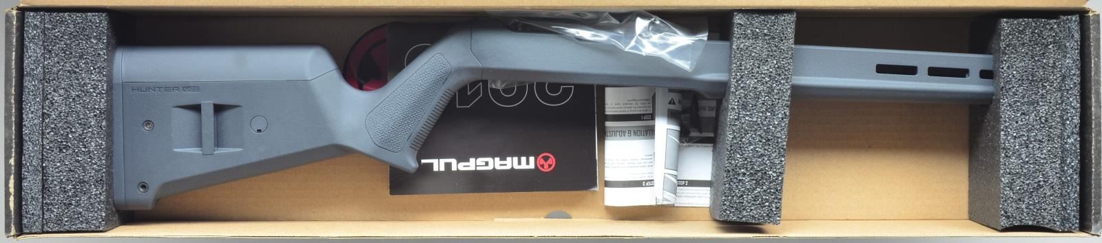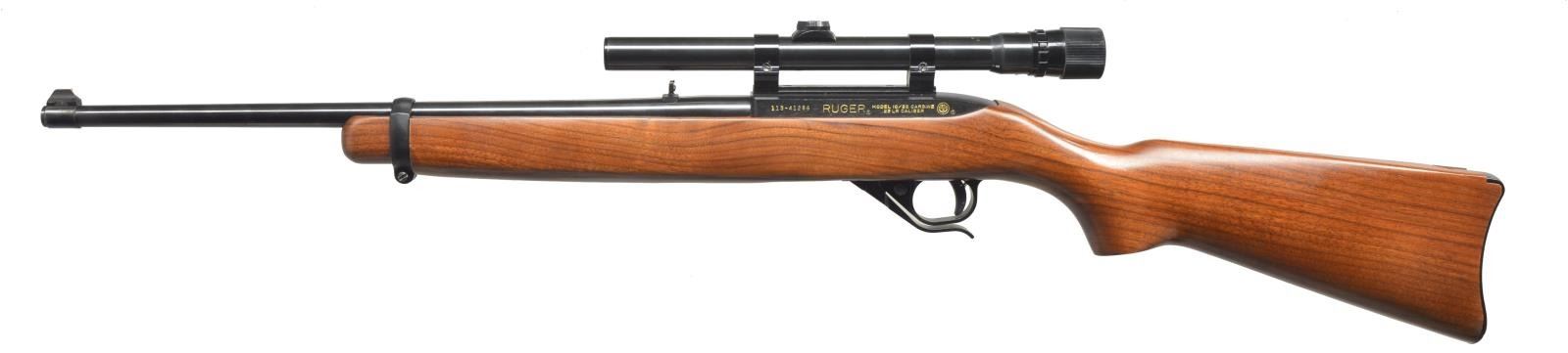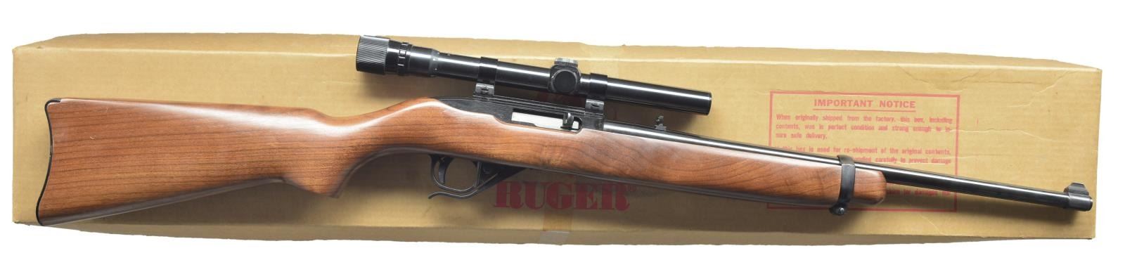 Cal. 22 LR. S# 113-41286. Bbl. 18 1/2" w/ standard factory sights. Mfg. 1974 w/ nice grained walnut stock having black anodized carbine buttplate. Factory scope base w/ Weaver V22 duplex reticle scope of 3-6 power. Receiver & pre-warning bbl. enhanced w/ Bonanza gold fill in lettering. Trigger assembly replaced w/ Timney unit having extended mag. release, auto bolt release & 2 lb. trigger pull (no creep). MAGS: 1 factory 10 rd. UNATTACHED ACCESSORIES: original factory 2 piece brown box w/ 1974 manual. Magpul Hunter X-2 (appearing new in box) stock assembly. Ruger factory checkered black plastic stock. CONDITION: very good plus overall appearance w/ occasional sm. marks on stock including sm. dent on grip butt. Sm. scratches by scope ring screws; metal finish & all other aspects near excellent including bore & optics. (21-1067/NW). MODERN. $500-700.