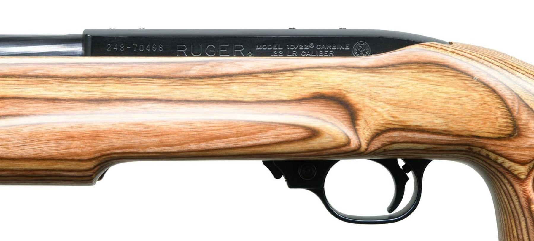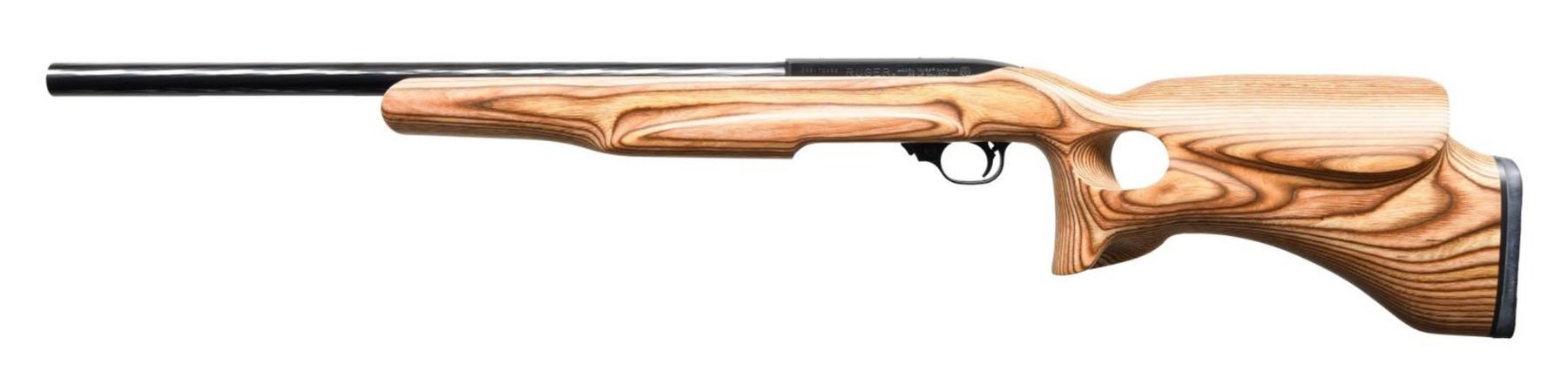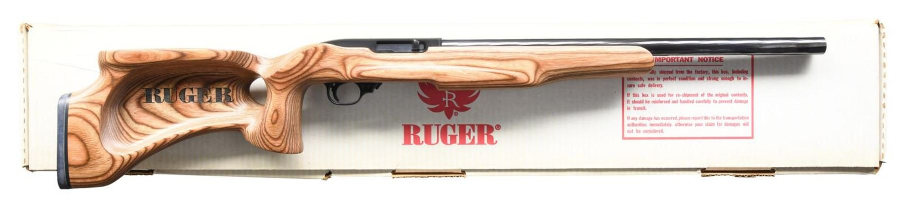 Cal. 22 LR. S# 248-70468. Bbl. 18.5" heavy weight Hammer Forged target. Mfg. 1998 as Model 01138 having now discontinued configuration laminated thumbhole target stock of laminated walnut stained birch. Right side opposite roll over cheek piece has depression with "RUGER" laser engraved. Style is similar to Barracuda style, yet distinctly Ruger. MAGS: 1 factory 10 rd. UNATTACHED ACCESSORIES: original box with packaging labeled as "10/22-T/TS". CONDITION: all aspects near excellent with new unfired appearance. PROVENANCE: The Collection of Gun Sport Ltd owned by Jon R. Thomas. (23-3296/NW). MODERN. $500-750.