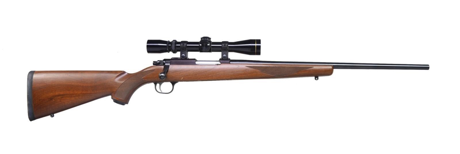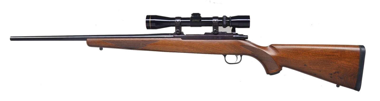 Cal. 22 Hornet. S# 720-12463. Bbl. 20" light sporter weight w/out sights. Leupold VARI-X 3x9 gloss finished compact scope w/ duplex reticle on Ruger rings & integral mts. Walnut sporter stock w/ cut checkering, grip cap, swivel bases & black Ruger rifle pad. 1995 Mfg. MAGS: 1 rotary 6 rd. CONDITION: 99% metal finish. Stock shows a few sm. marks w/ spots of dark residue on left side of butt. Bright near excellent bore. Scope has bright optics. (20-2882/DS). MODERN. $500-800.