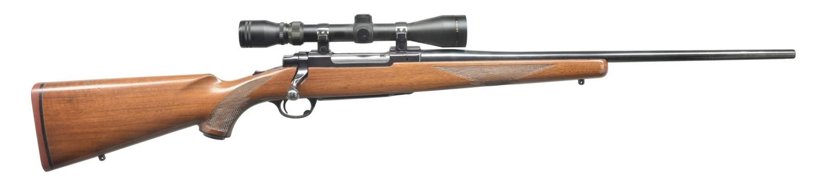 Cal. 257 Roberts. S# 75-17630. Bbl. 22" lightweight has warning & Ruger address on top. Standard length Ruger 77 action features integral scope bases, tang safety & hinged floorplate. Capped pistol grip stock of very lightly figured American walnut features Ruger rifle pad, sling eyes & point pattern checkering. Rifle is fitted w/ Simmons 3-9x scope w/ duplex reticle in Ruger rings. CONDITION: fine w/ slight alteration. Metal parts retain over 90% original finish w/ some cleaning & light pitting at front end of bbl. & some chips in lacquer on floorplate. Stock appears to have most of the original finish w/ numerous light marks & a coat of oil laid over the top. Bright bore. Scope is fine, optically clear. (20-3567/MGM). MODERN. $450-650.