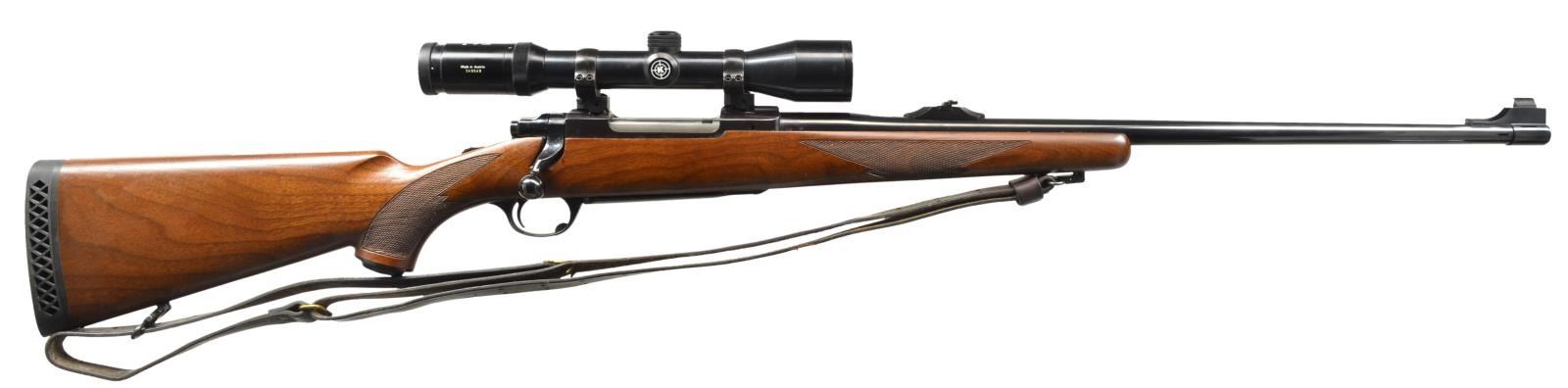Cal. 338 Win. Mag. S# 770-07406. Bbl. 24" w/ custom slotted porting. Ramp mounted bead front sight w/ island mounted folding U notch rear sight. Action features top tang safety & integral scope bases. Karl Kahles Helia S 1.5-6x42 30mm scope w/ European 3 post reticle on European mts. Straight comb stock of checkered walnut w/ plastic grip cap having Ruger trademark. LOP: 14" over black ventilated Pachmayr pad. Military style leather sling on QD swivels. 1986 Mfg. CONDITION: 98% blue. Good original stock finish showing sm. mildew spots. Bright bore w/ sharp rifling. Scope has bright optics. (20-2782/DS). MODERN. $750-1,250.