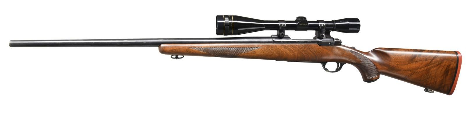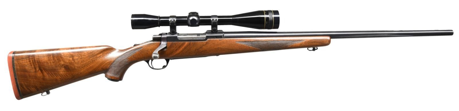 RIFLE. Cal. 220 Swift. S# 70-83492. Bbl. 26" heavy with no provision for front sight. Filler screws in location of rear sight. Top of bbl marked "STURM, RUGER & CO. INC., SOUTHPORT, CONN, U.S.A.". Receiver mounted with Leupold 12x scope. Flat bolt. Tang safety. Standard Ruger stock with 2 panel checkered forend. Checkered pistol grip with black Ruger grip cap and rounded red Ruger pad. Front and rear sling swivels. CONDITION: bbl and action have very good original finish. Bbl shows areas of thinning finish; notable on forward half. Floorplate and triggerguard show high edge wear with minor scratches and a couple spots of missing finish. Good original stock shows scattered moderate dents and scratches with flattening of diamonds. Front sling swivel is loose. Good bore with minor frosting and pitting. (23-4928/BH). MODERN. $1,000-1,500.