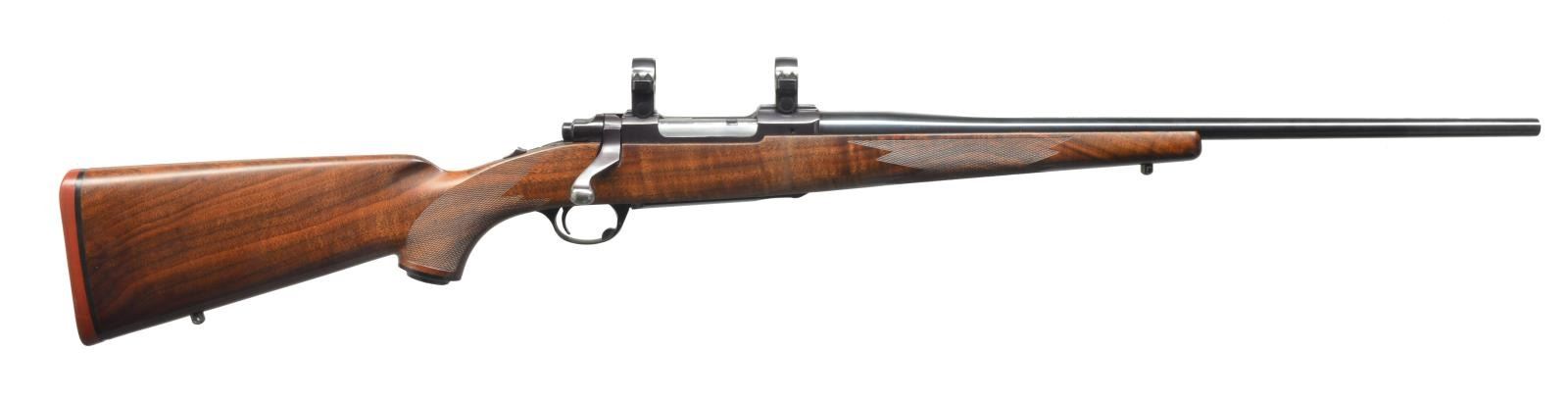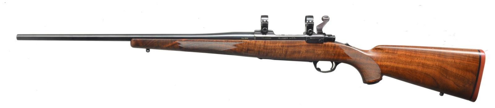 Cal. 6mm Rem. S# 70-48636. Bbl. 22” rnd. made w/ out sights. Receiver is cut for Ruger rings, installed. Restocked w/ nicely figured dark walnut having noticeably thinner forend w/ multi point wrap around checkering; grip area more fully checkered than standard Ruger style w/ distinct curve towards butt. Recoil lug area of action & 1 1/2" of bbl. glass bedded w/ brown Brownell's Micro Bed. Black grip cap w/ Ruger emblem. Solid red Ruger pad. CONDITION: bbl. retains good original blue w/ minor muzzle wear & some minor scratches. Receiver retains original blue w/ minor sharp edge wear. Floorplate & trigger guard retain original finish w/ some minor sharp edge wear & ding in floorplate. Stock has oil finish w/ some minor handling marks. Stock has a hairline crack behind top tang. Bolt handle is thinning. Near excellent bore. (20-4146/BT). MODERN. $600-900.
