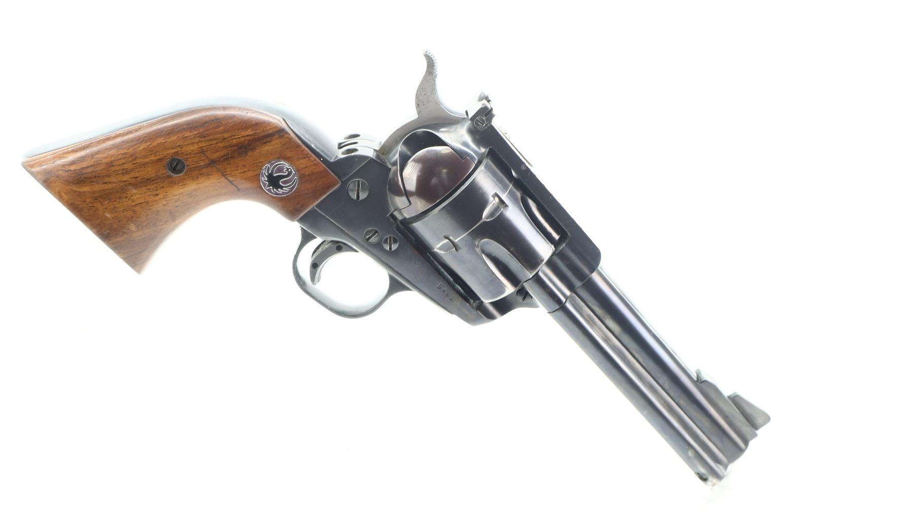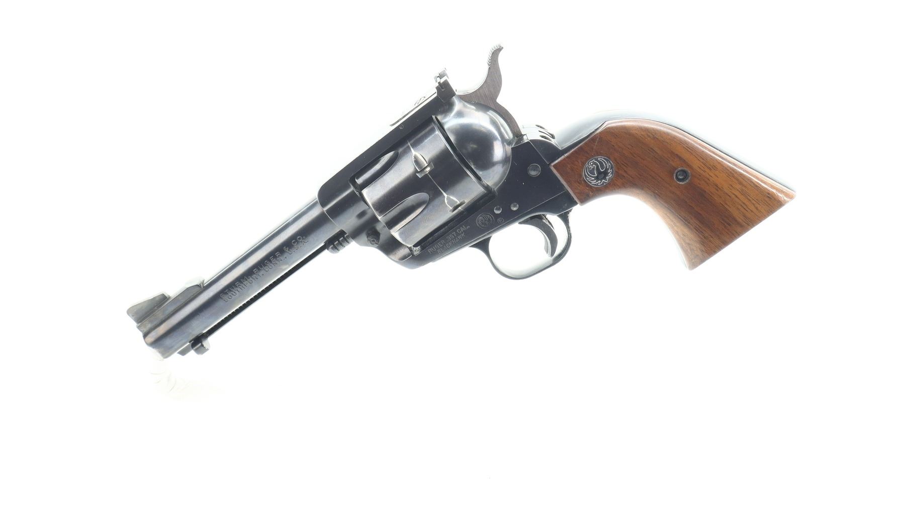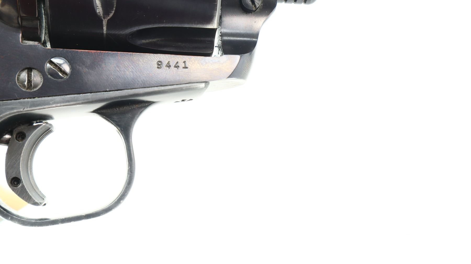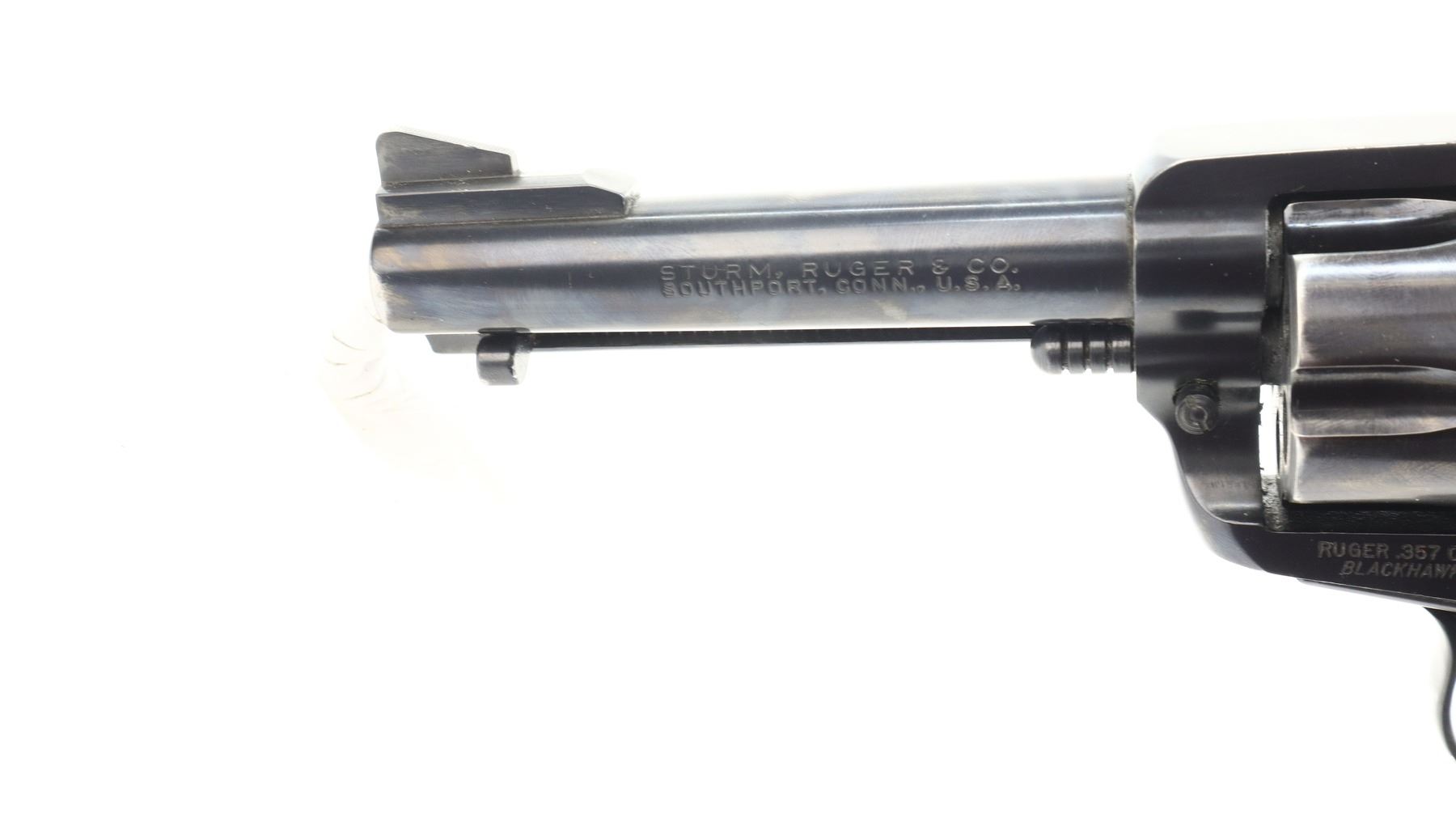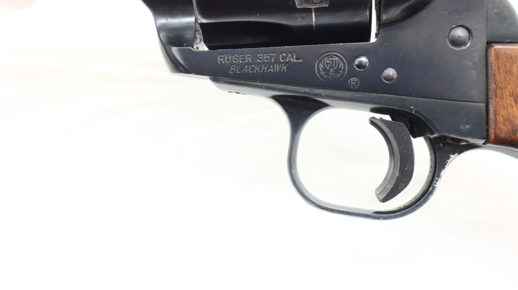 6+/10, CLASS: CANADIAN RESTRICTED, RUGER , MODEL: BLACKHAWK 3 SCREW, CALIBER: 357 MAG , BORE IS VERY GOOD, SHINY, FUNCTIONS MECHANICALLY AS DESIGNED. BLADE FRONT SIGHT WITH RAMP. ADJUSTABLE U NOTCH SIGHT. BLUED FINISH GROOVED SPUR HAMMER, TRIGGER HAS ATTACHED SHOE. BLACK ALLOY TRIGGER GUARD AND BACK STRAP. TWO PIECE SMOOTH BROWN WOOD GRIPS WITH RUGER MEDALLIONS. EJECTOR ROD UNDER RIGHT SIDE OF BARREL. METAL FINISH SHOWS SOME SCRATCHES, HANDLING MARKS AND WEAR. GRIPS SHOW SOME MARKS, SCRATCHES AND WEAR. , ACTION: REVOLVER , BARREL LENGTH: 115MM, CONDITION: 6+/10, SERIAL #: 9441, CLASS: CANADIAN RESTRICTED